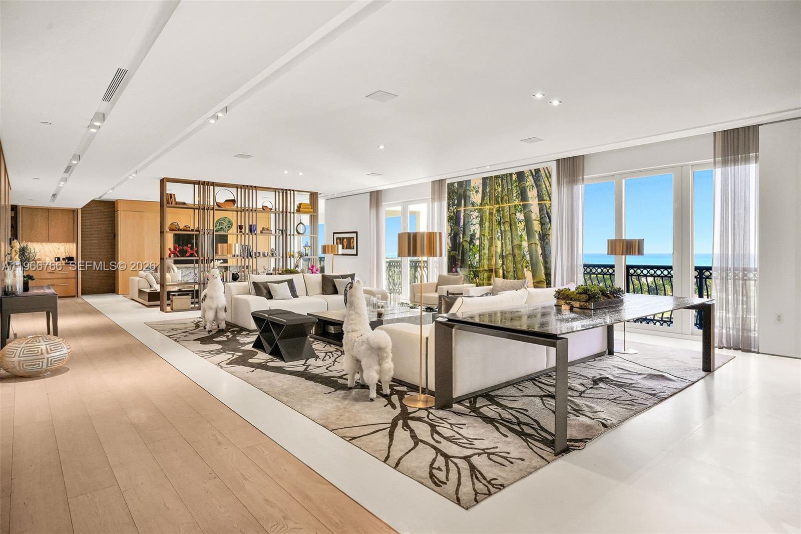 Rare Luxury Opportunity: $500K Plus Assessment ALREADY PAID IN FULL by Seller. This expansive waterfront residence in Aventura offers breathtaking views of the Intracoastal waterway, Golden Beach, and Atlantic Ocean. The layout includes two VIP suites, one junior suite, two guest bedrooms, 6.5 bathrooms, and separate service quarters. Living areas include an office, den, main salon, formal dining room, kitchen, and breakfast area. A private elevator opens to a secure foyer clad in Terra Bianca quartzite with a glass atrium feature. A book-matched Terra Bianca quartzite feature wall with antique brass inlays highlights the central core of the 6-bedroom home. Located in one of Aventura’s premier high-security buildings with 24-hour concierge, valet, and resort-style amenities, this residence offers privacy, luxury, and convenience in one of the area’s most desirable waterfront locations. The residence is a jewel of Aventura, completely remodeled with the highest quality materials, imported marbles, and designer furniture and lighting, including Flos and Oluce.