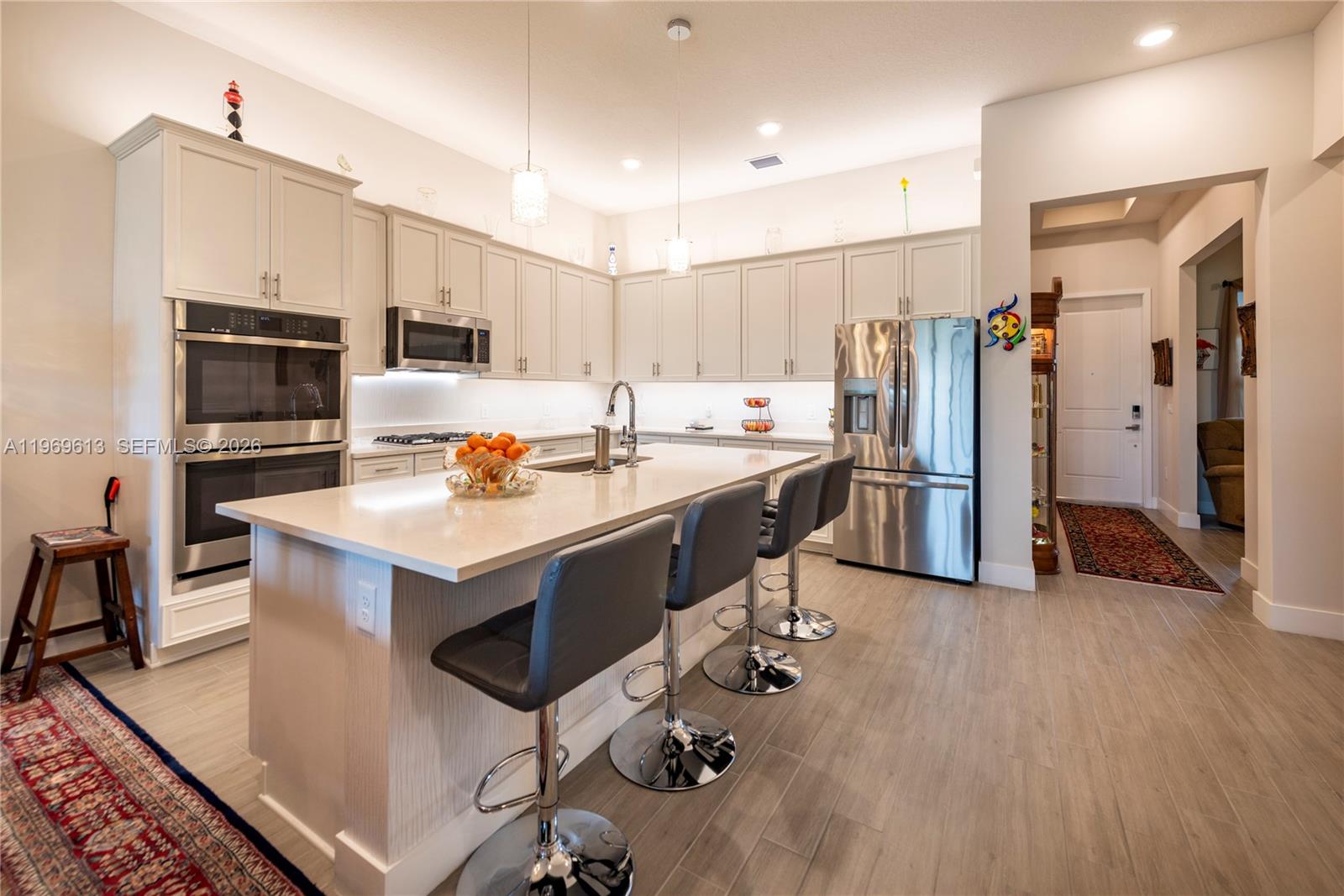 Welcome home to the Falls at Parkland, and a beautifully appointed 3 bedroom, 2 bath 55+ Villa, with upgraded 42 inch kitchen cabinets, under cabinet lighting, white quartz countertops with huge island for enjoying casual meals, upgraded baths with neutral tile, California closets, tray ceilings, custom painting throughout, easy to maintain plank style tile flooring. Relax on screen back porch with serene lake view. Garage has epoxy coated flooring, with longest driveway in the community. Walk to mailbox, and guest parking. Resort style Clubhouse designed for active and vibrant living, complete with heated pool, spa, cafe, sauna, tennis, pickleball courts, and an awesome social calendar. Immaculate, move in condition.