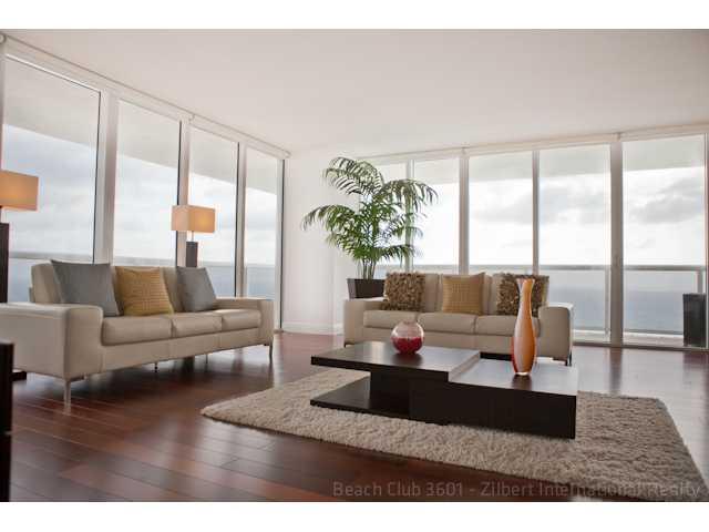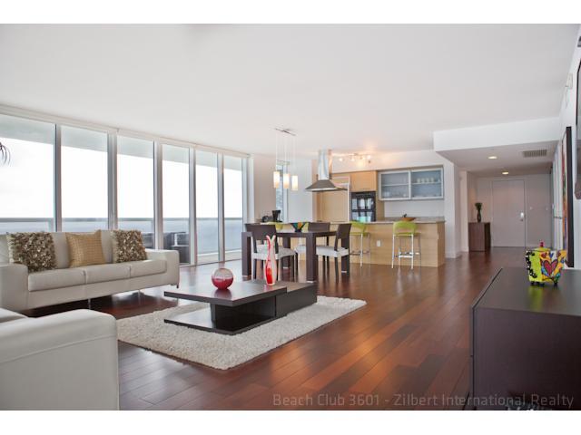 Unit 3601 is located in the NORTH - EAST corner of building with DIRECT OCEAN VIEWS. Featuring over 2060 SQ FT of living area & 450 SQ FT of wrap around balconies, amazing Brazilian cherry wood floors & marble on the balcony, custom made walk in closets, window treatments, modern furniture & decoration. This 3 BED/3 BATH is your house in the sky! Professionally designed, with capacity for family of 5 to 6p. 1 assigned parking space. Perfect for snowbirds & family vacations. Call LA!