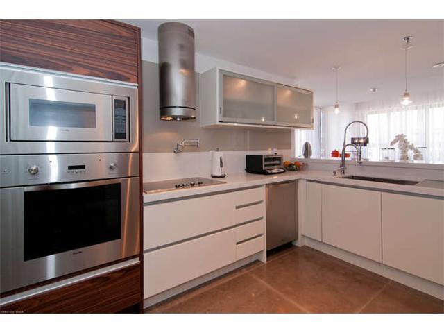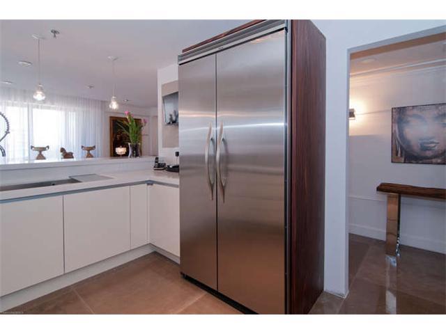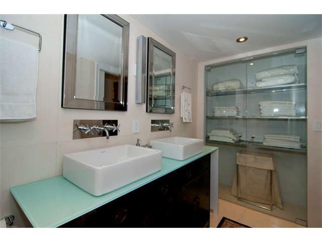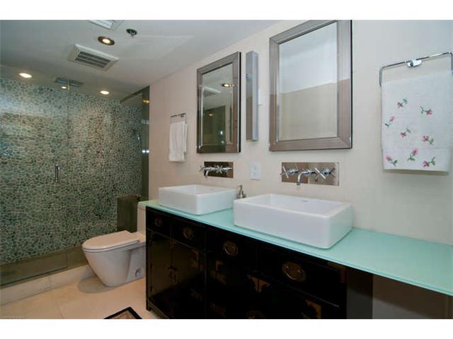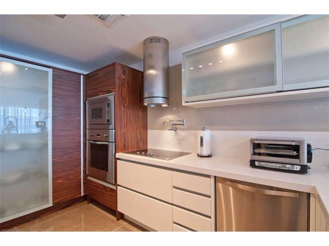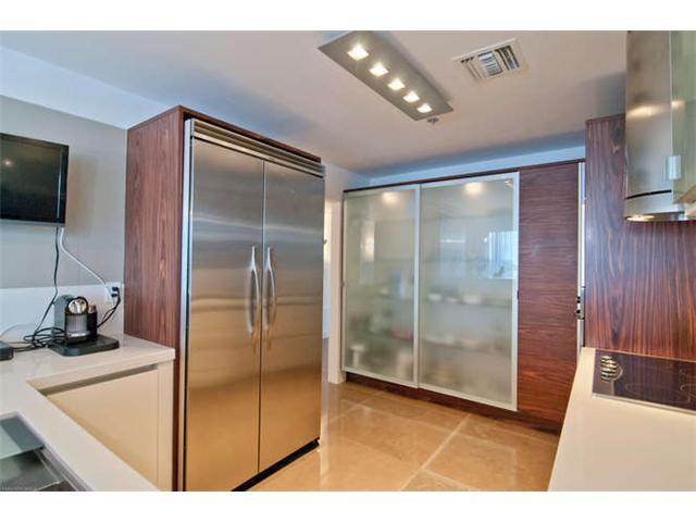 Get a "Penthouse" feeling from this unique corner unit with lots of privacy. Completely remodeled 3/2.5, elegantly lavished in Portuguese limestone in living areas, wood floors in all bedrooms. Vanities are Phillip Stark Duravit, Kitchen appliances are Vi king, sink fawcets from Blanco. 2 assigned and deeded parking spaces. Custom built closets, paneling, beautiful recessed lighting. Approx 500 SF of balcony with slope views to S Beach and Grove.