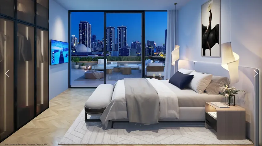 The 44-story WEST Eleventh Residences Miami features 659 luxury residences with breathtaking views of the Miami skyline and Biscayne Bay, from spacious studios to one-bedroom configurations, with ten-feet ceiling heights, floor-to-ceiling glass windows, and porcelain tile floors. Individual finishes, furniture, and appliances meet the standards of five-star hotels.