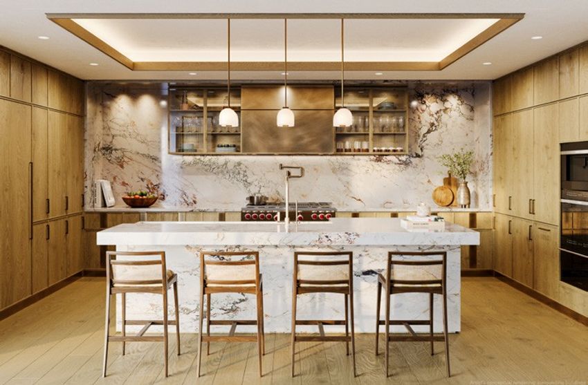 The custom-designed kitchens by Tara Bernerd & Partners feature a selection of Sub-Zero & Wolf appliances, including a built-in dual-fuel stove, full-size wine storage, steam oven, ice maker, and coffee maker.