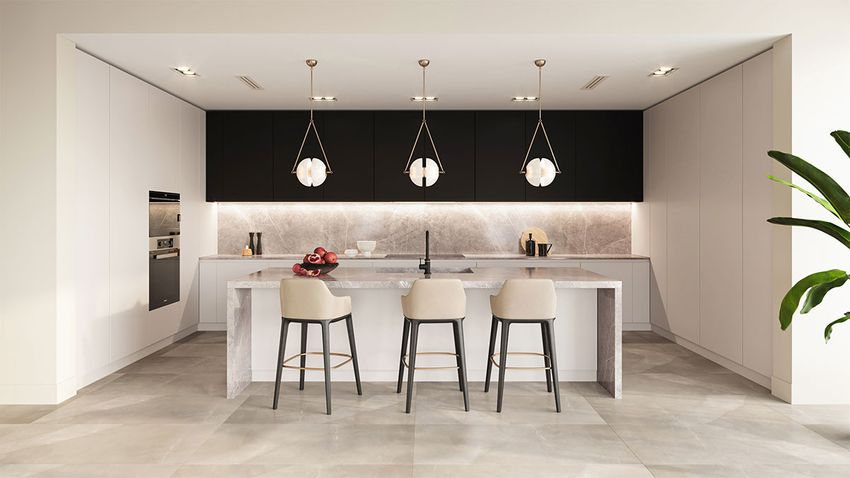 The finishes are predominantly high-quality Italian materials, including modern wall panels and marble-styled porcelain stoneware floors throughout the residence, except for the bedrooms, where the floors are tiled with high-quality wide planks. An extensive palette of interiors will allow you to choose a color scheme to your liking.