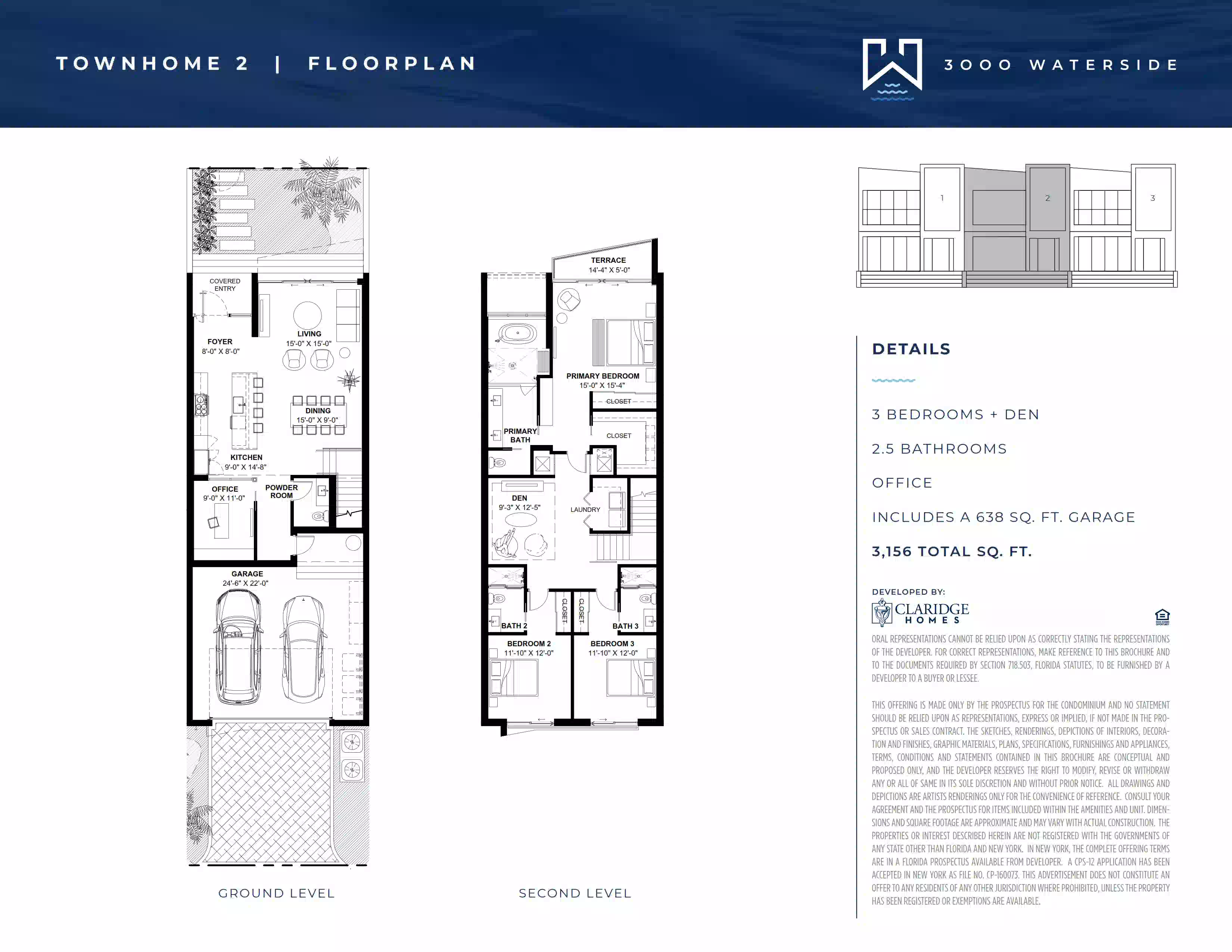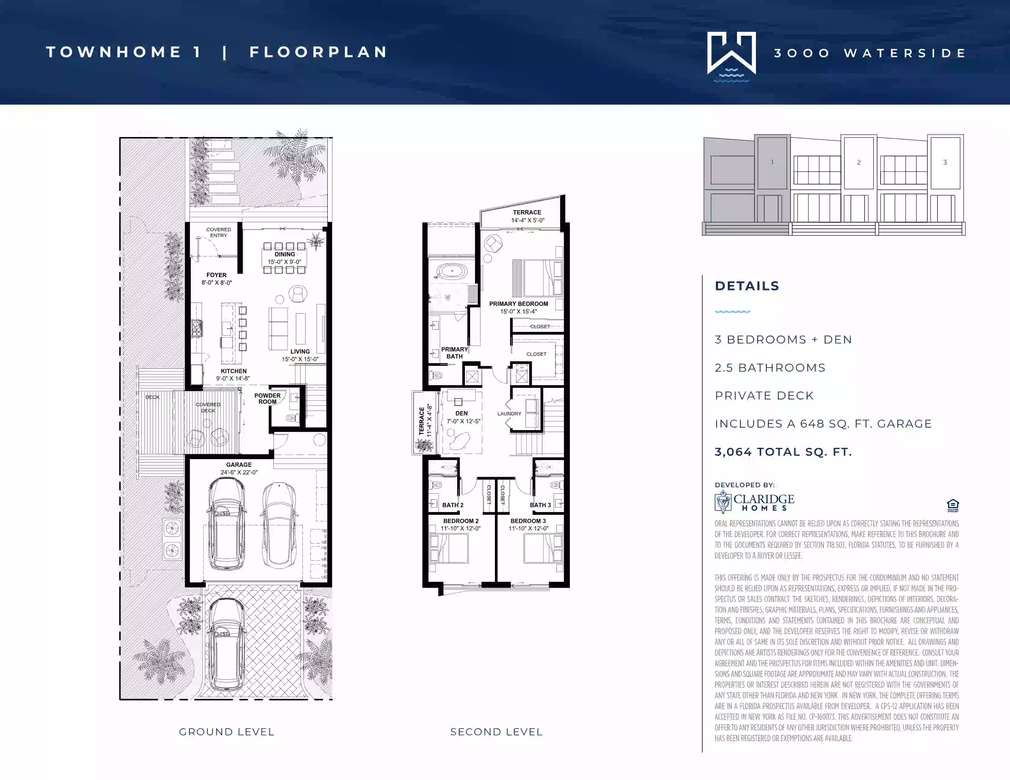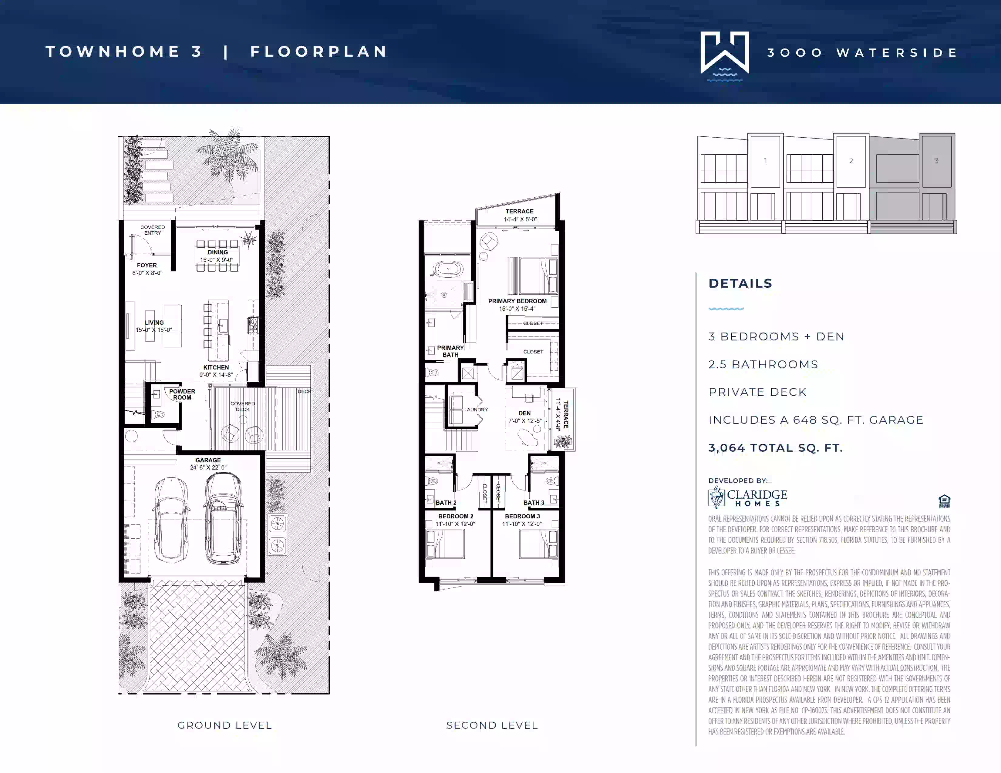 También destaca la íntima colección de townhomes de 3000 Waterside Residences. Esta propuesta incluye solo tres townhomes de tres dormitorios con amplios interiores, electrodomésticos contemporáneos, patios privados y balcones. Las superficies interiores van de aproximadamente 3.064 a 3.156 pies cuadrados.