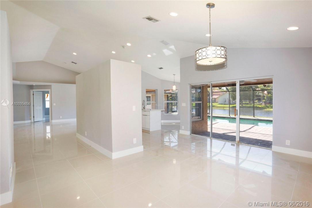 This 3/2.5 home is a rare model with screened-in pool and waterfront. With an open concept layout and vaulted ceilings this airy and bright property offers gorgeous views from every room. Fully remodeled including new kitchen featuring modern cabinetry with quartz countertop, stainless steel appliances; remodeled baths including new vanities with quartz countertops and vessel sinks. Modern 24x24" porcelain flooring with new 5.25" baseboards, new Kichler lighting fixtures & recessed lighting throughout.