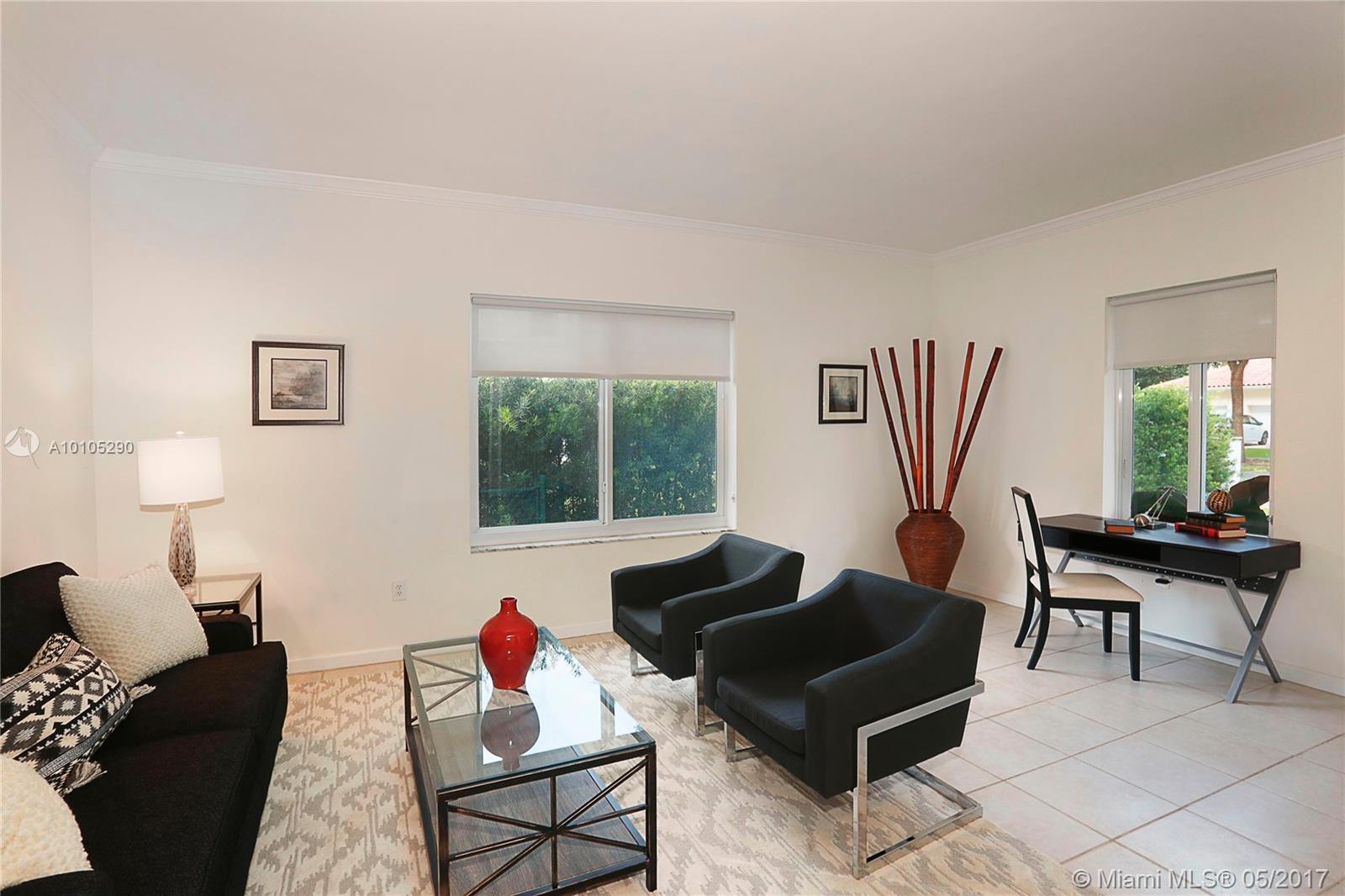 Beautiful, contemporary home situated in the Golden Triangle on wonderful street. The large spaces & open flrplan offer fam rm, kitchen & dining rm all adjacent creating a perfect entertaining home. Spacious den could be used as frml space or as office or playrm. 2 bedrms down w/ private master ste upstairs. Wonderful details include impact glass, hdwd & tile flrs, screened terrace, tiled garage, master w/walk-in closet & granite countertops. Conveniently located to Youth Center, Venetian Pool & airport.