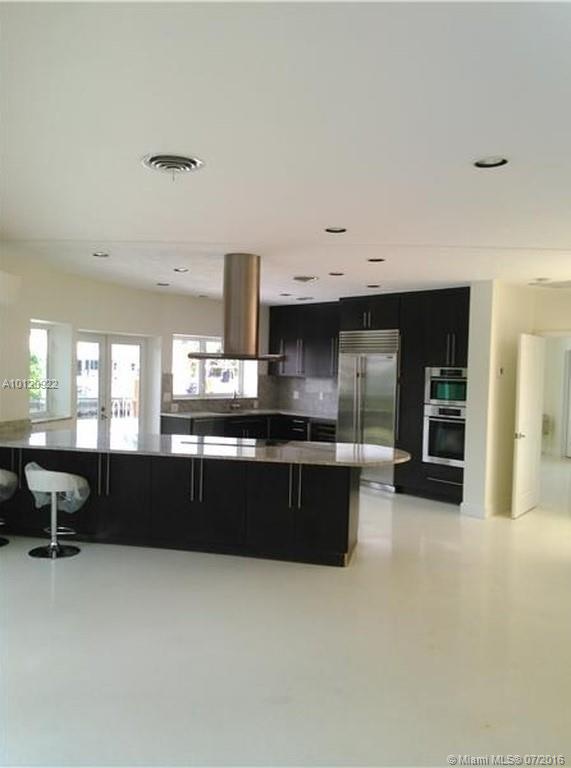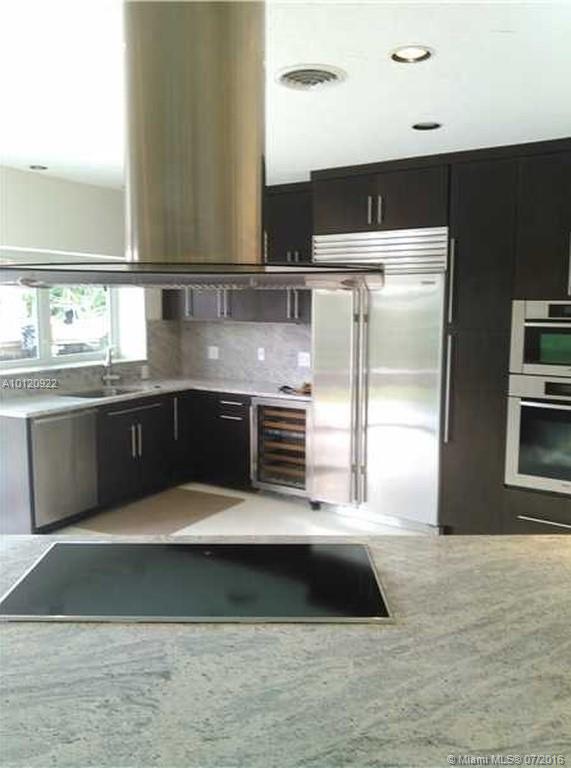 Gated, quiet community. Contemporary style home, beautifully remodeled in 2013. The curved living and entertainment area is surrounded by French doors opening to waterfront pool, patio and garden. New seawall with 75'dock, 16K boatlift and no fixed bridge s to bay Gourmet kitchen with center island, Miele Appliances, with subzero refrigerator. Jerusalem tiled bathrooms. 20' high domed ceiling dining room with skylight. Near Whole Food, shops and restaurants. Short drive to Bal Harbour and beaches.