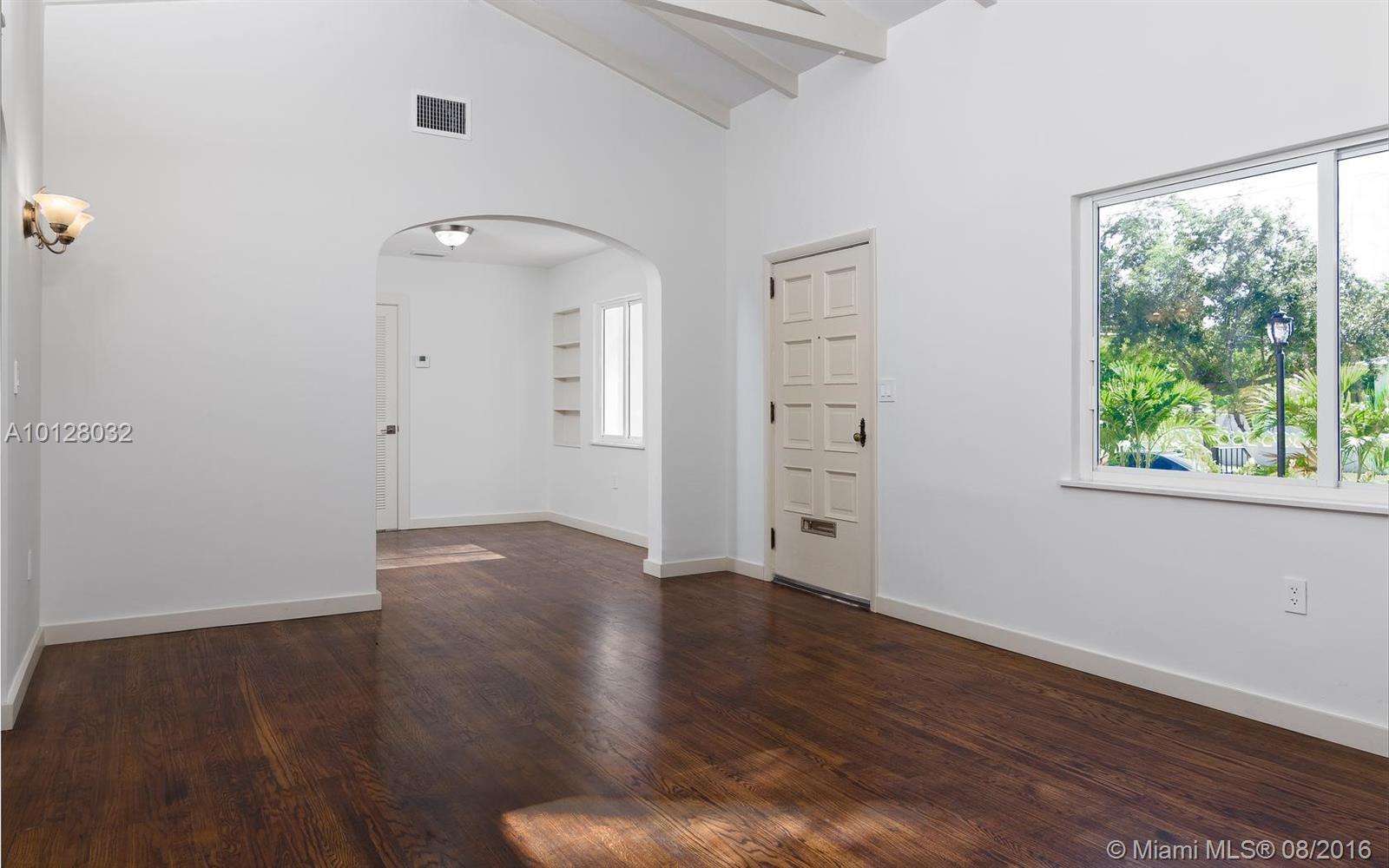Completely renovated & detailed 2 bedroom, 1 bath home is situated on a raised corner lot centrally located in an excellent Miami Shores neighborhood. This 1939 home features open beam ceilings, arches, original oak flooring & a carved stone fireplace. Gourmet quartz kitchen with slate GE appliances & gas stove. The bathroom has floor to ceiling Italian marble & whirlpool tub. Attached 2-car garage with driveway off the alley includes new Samsung washer & dryer. Landscaping & patios in from & back yards.