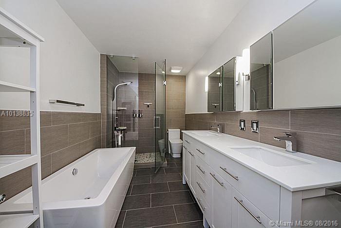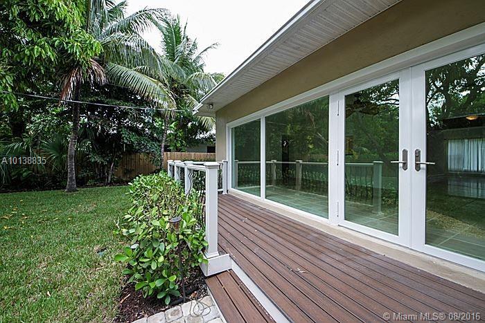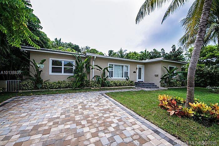 Exceptionally remodeled Miami Shores home w/quality materials & finishes. Everything's been done from bathrooms, kitchen, Travertine marble throughout, impact windows/doors, lush tropical landscaping in the back-yard as well as the front. Backyard features fruit trees & a long wide back-porch. Front of the house features wide/pavered driveway. Interior features large fam room w/numerous windows/doors, makes you feel you're outside. There's also a bonus den/office that could be converted to 4th bedroom.
