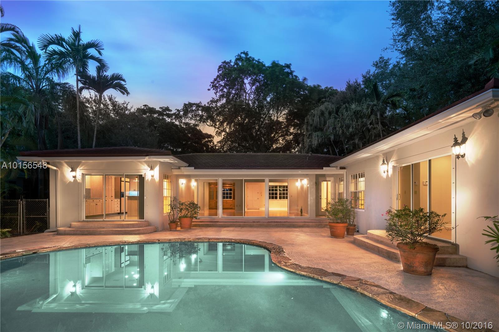 On a quiet, low traffic street in Coral Gables' prized "Golden Triangle" neighborhood close to the Library & Youth Center, the Venetian Pool & the Biltmore Hotel, find this roomy (close to 3000 square feet) 3 bedroom 3 bath 1950's home with high ceilings, gleaming oak floors, walls of glass doors looking out to a tropical paradise with a dreamy lagoon style pool with waterfall on a 10,4250 sq ft lot. Needs updating in kitchen & baths but very large kitchen & and master bath spaces to work with. Garage,