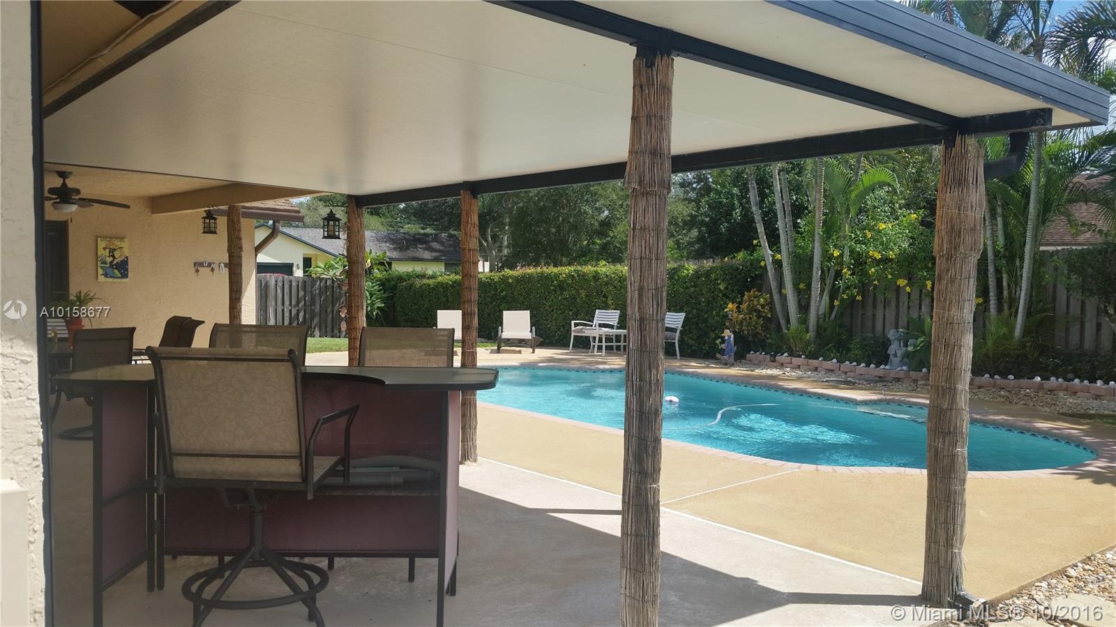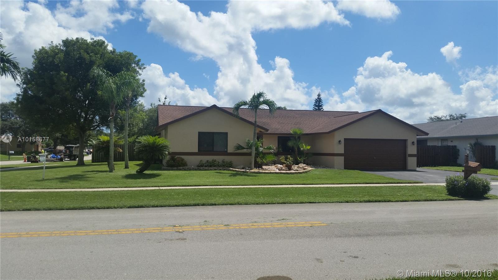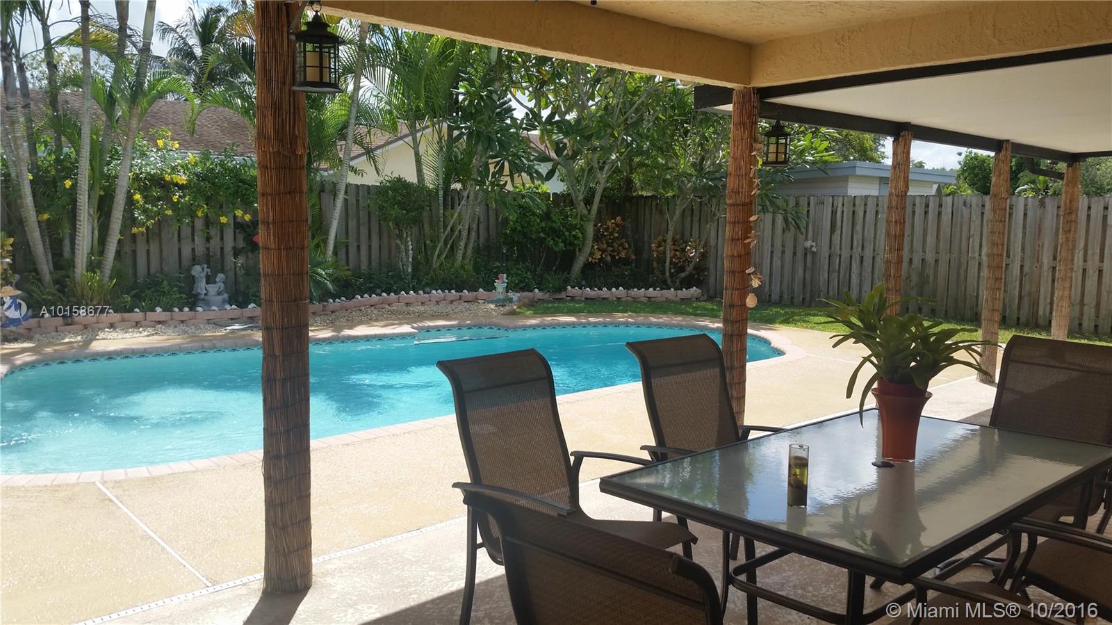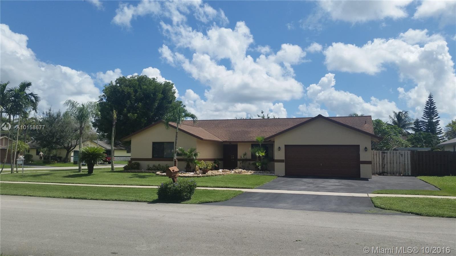 This Beautiful Corner Pool home is nestled in a tranquil neighborhood located in the Weston area. Features:4 huge bedrooms w/2 full baths, 2,585sf-2 car garage, large master suite w/ample walk-in closet, gorgeous marble & tile floors, Formal living & dining room, spacious floor plan w/newer kitchen that opens to charming family room, Huge patio w/sparkling pool perfect setting for outdoor entertaining, fenced back yard in a tropical setting-Weston A rated schools-HOA$15/month! Immaculate. ROOM FOR A BOAT.