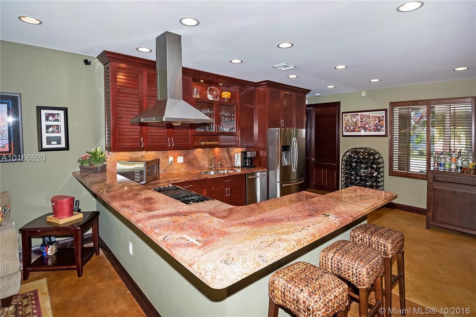 This sensational Poinsettia Heights home is a one-of-a-kind gem! Rare stained pressed concrete floors throughout showcase the home's expansive open plan lay-out. 3 Large bedrooms, including 2 Masters with en-suite bathrooms, walk-in California closets and outdoor patio access. Double French doors invite you to one of the most splendid outdoor areas! Sparkling salt water pool nestled in the large tropical yard and jaw-dropping lavish summer kitchen. Walking distance to Whole foods, dining and entertainment