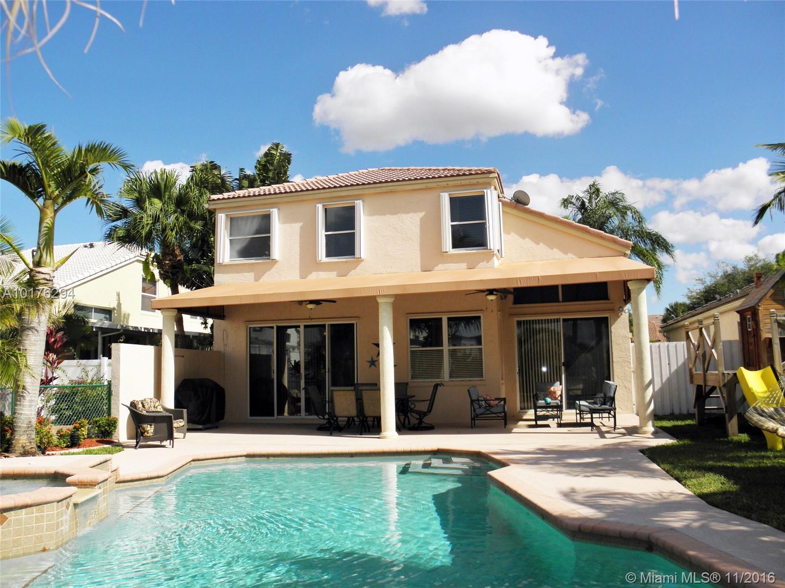 Lakefront house with pool/spa, centrally located in west Pembroke Pines just off I-75, oversize lot, beautiful backyard with tiki hut perfect to enjoy the best of South Florida lifestyle!! 3 bedrooms, 2-1/2 baths, tile flooring with beautiful laminated floors from the stairs up. Large covered terrace. Master bedroom with tray ceiling walk-in closet, bathroom with dual sinks roman tub and separate shower. Open eat-in kitchen. Gated community. Newer high efficiency A/C and tank-less water heater. Must see!