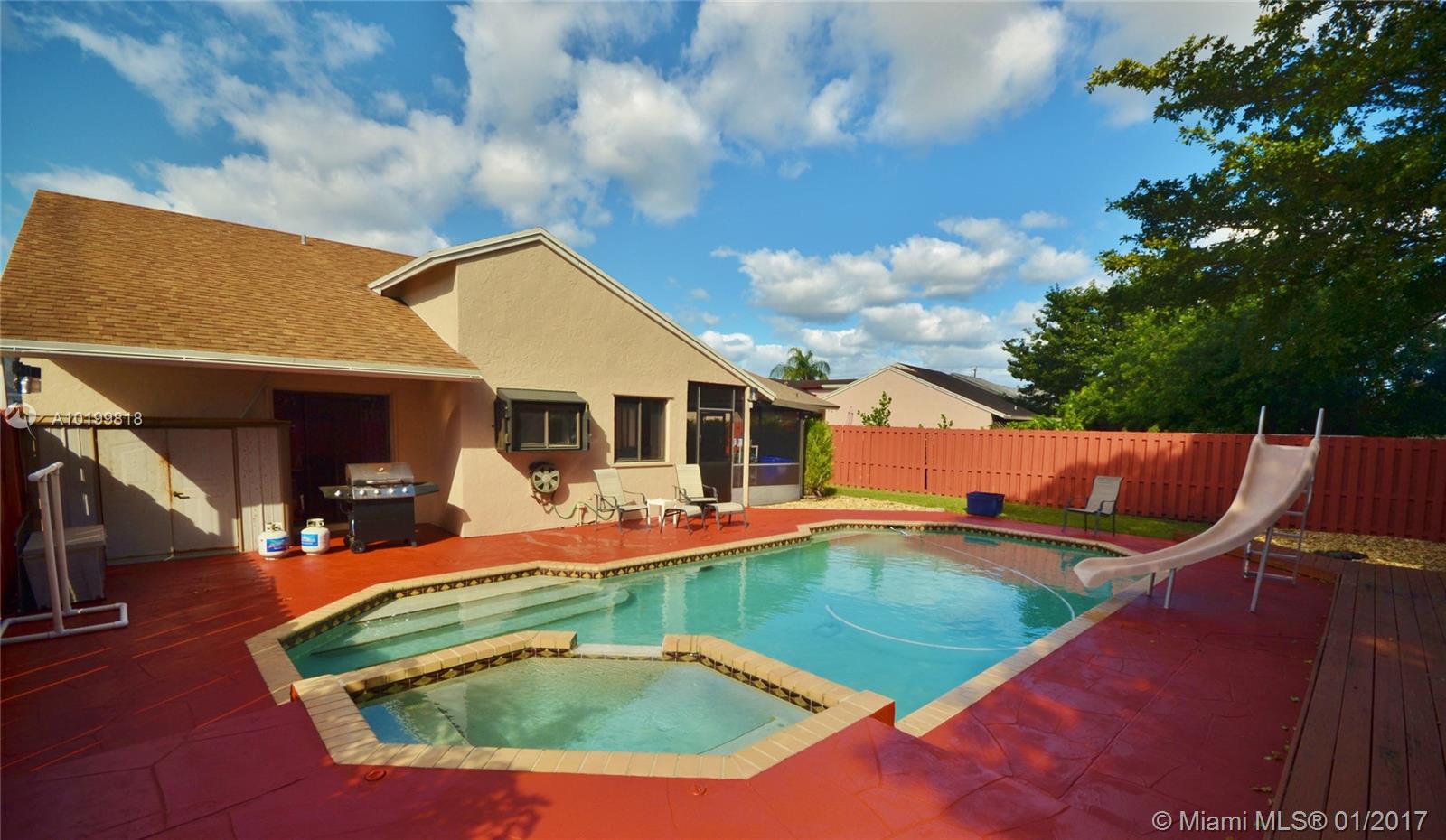 Rare find in this charming 4bed pool home in centrally located Woodbridge. Over 1800 sq ft of living area features triple split open floor plan, interior laundry room, vaulted ceilings, new roof '08, new AC '09. Your family will enjoy spacious covered patios leading to huge pool in large fenced yard. Fresh exterior paint, covered screened entry, 2car parking pad, extra shed complete this great home. Near schools, shopping, restaurants, beaches, MIA & FLL. Easy access to transportation. Low HOA $126 QTR!