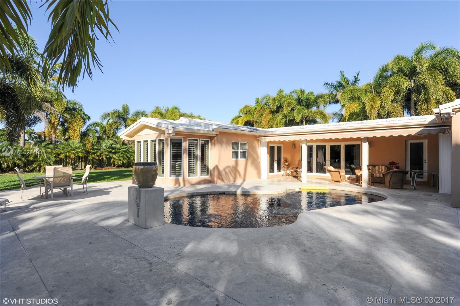 Magnificent canal home w/great curb appeal & nicely updated. Located on quiet residential street, it features spacious living rm & dining rm, gourmet kitchen/wood cabinets & granite countertops opens to the family rm & overlooks exquisite pool & covered patio area. Marble floors except carpet in 2 bedrooms, crown molding & impact doors, closets galore, ample master bedroom has large walk-in closet. Natural light & very big & well maintained back & side yard for your boat. Circular driveway. AHS warranty.