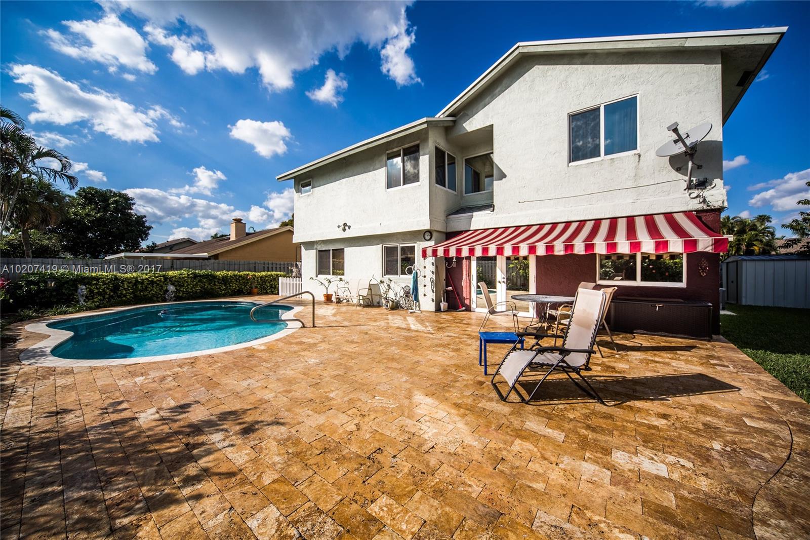 MOST COVETED HOME ON THE BLOCK. THIS 4 BEDROOM -3 FULL BATHROOM + BONUS ROOM HOME HAS IT ALL!!! CIRCULAR DRIVEWAY - HIGH IMPACT WINDOWS & DOORS - NEW ROOF (REPLACED 3 YRS AGO WITH WARRANTY) - WOOD FLOORS AND TILES THROUGHOUT - WOOD KITCHEN CABINETS - 2 A/C UNITS - AMAZING BACKYARD, IDEAL TO ENTERTAIN - REMOTE RETRACTABLE AWNING - HUGE POOL - DROP DEAD GORGEOUS TRAVERTINE MARBLE THROUGHOUT POOL AREA -
