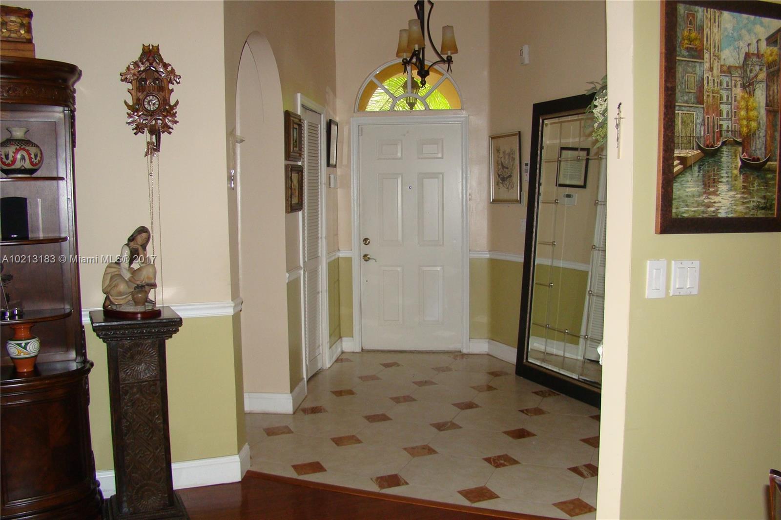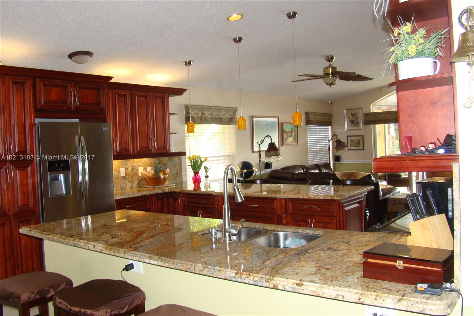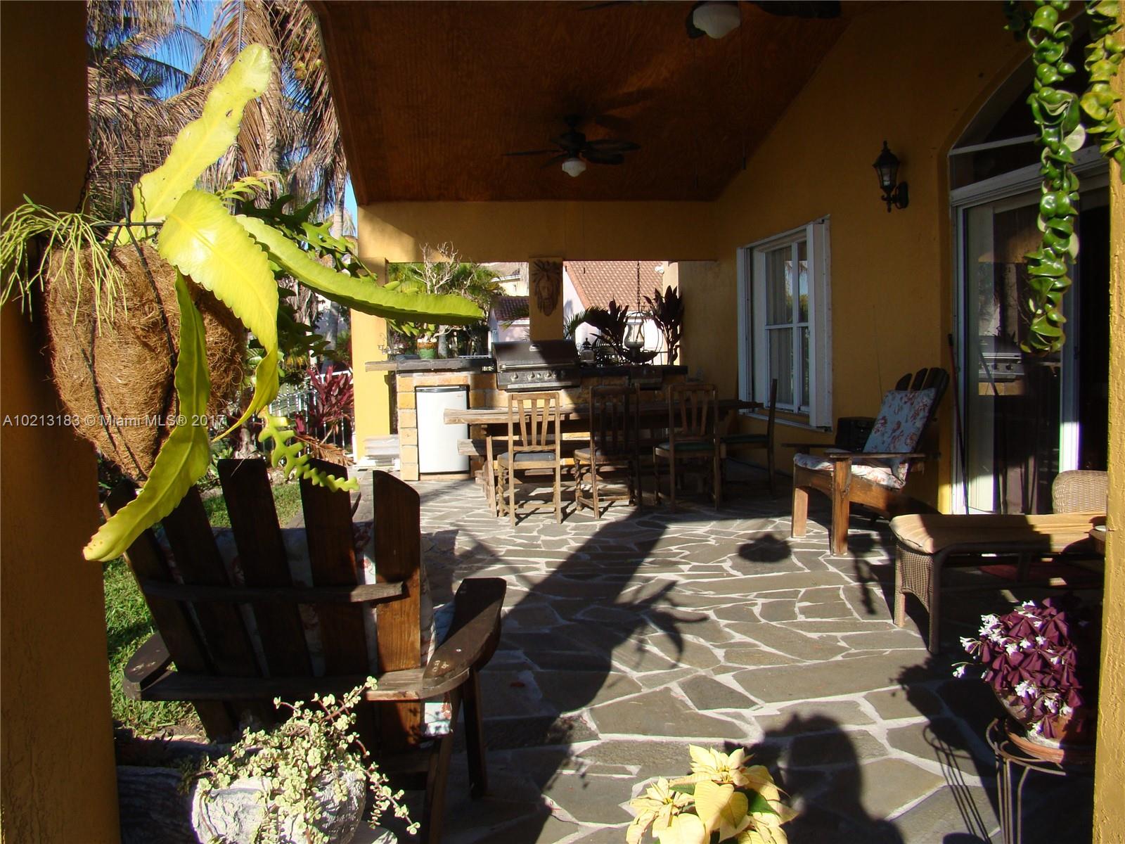 Rare finding. Amazing views. Tons of upgrades. Open house concept. Very large cover patio includes: dining/living areas and a build in kitchen/grill; stone floors and fire pit. Amazing indoor kitchen that can sit 10 people around it (Granite, wood cabinets, stainless steel appliances). Wood floors, tile and marble. Very large dining and living rooms. Master bedroom features an amazing spa (Jacuzzi & shower w. marble on floors and walls). Accordion hurricane shutters. Great schools. Will not last long.