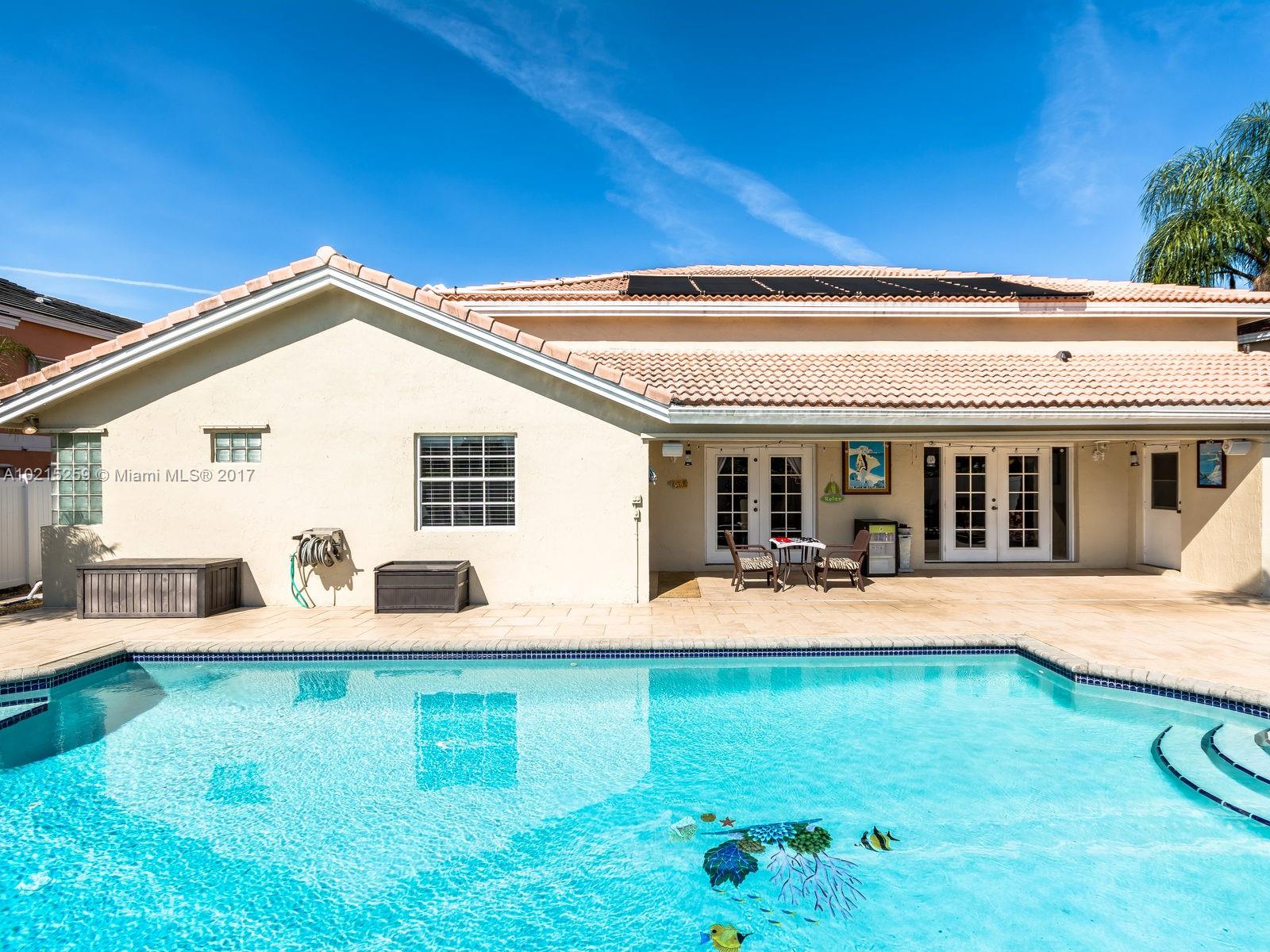 Gorgeous pool home offers: covered patio,cabana bathroom,spacious tiled backyard beautifully landscaped. 4 bed 3 bath 1 story ranch home,3 car garage,utility room,open floor plan,high ceilings. Spacious Master bathroom with view & exit to pool area through double French doors. Master bathroom with dual sinks, roman tub & separate shower. 2nd bath has dual sinks & private shower. Kitchen with granite counter tops, breakfast area & SS appliances. Oversized Family room to enjoy gatherings & football nights.
