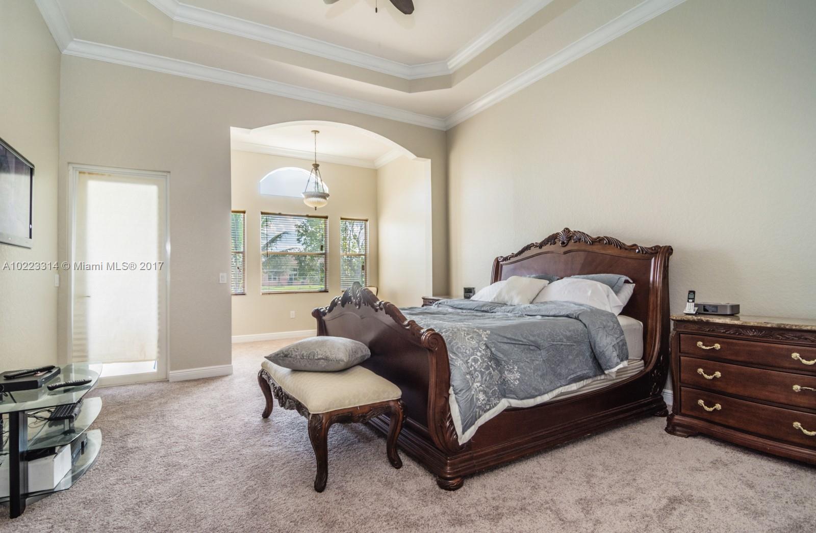 Tucked in a cul de sac with amazing, expansive paver driveway. Popular Residence 6 model with 4 bedrooms plus a large playroom (could be a bedroom) office and additional room with window off garage. 4.5 baths 3 car garage. Master bedroom with sitting room, his/hers bath w/ cabana bath to pool. Long lake views from custom pool and fully fenced yard. Soaring ceilings with Extensive crown moldings, gourmet kitchen with 42" wood cabinetry, granite countertops. Freshly painted interior in today's new hues.