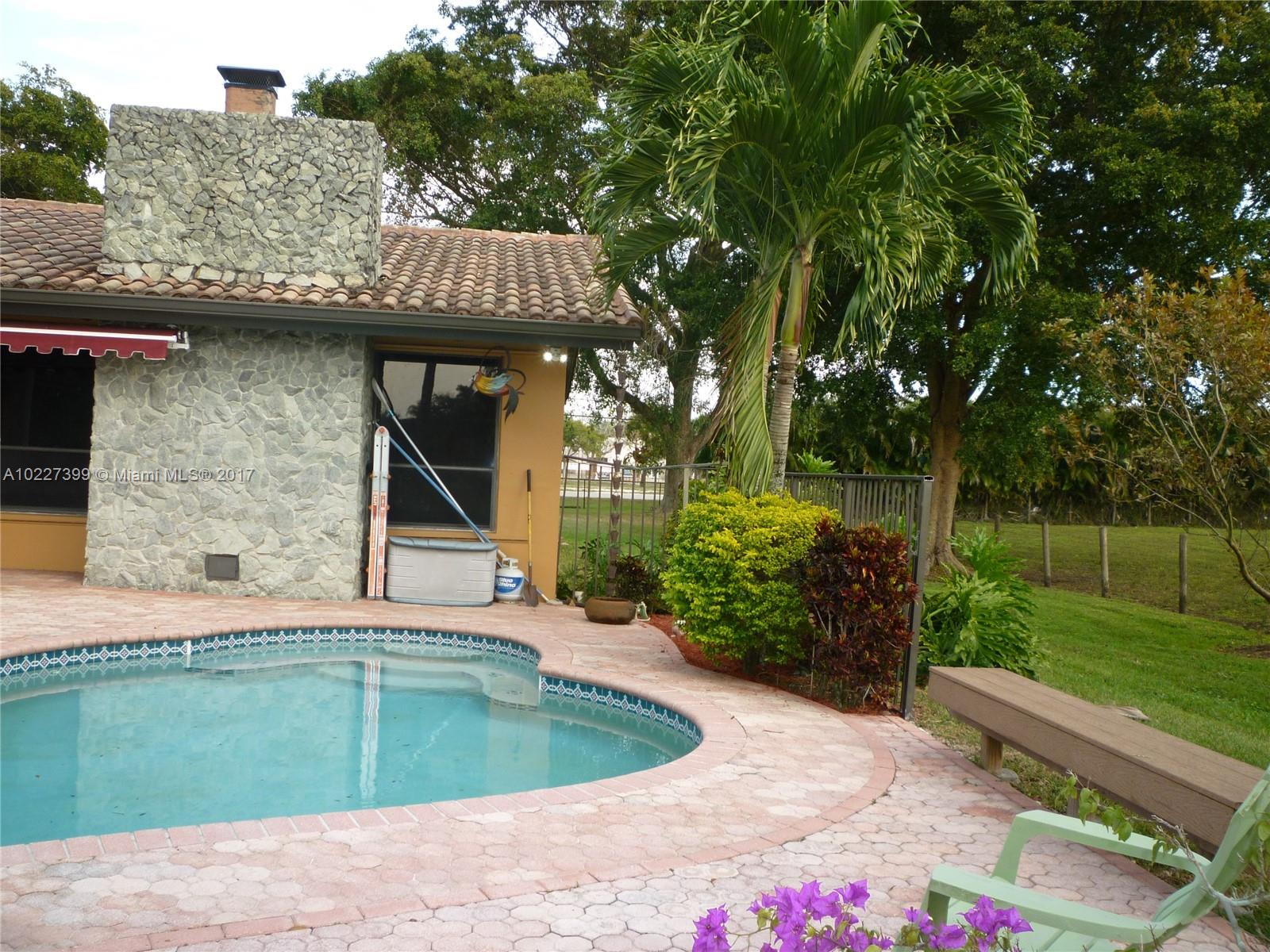 LUXURY COUNTRY LIVING, CUSTOM RANCH/CHALET STYLE, UPDATED 3 BEDS/3BATHS POOL HOME WITH 2 MASTER SUITES AND 2 MASTER BATHROOMS. LARGE CIRCULAR DRIVEWAY, MARBLE AND WOOD FLOORS, FIREPLACE, S/S APPLIANCES, GRANITE COUNTER TOPS, INDUSTRIAL GRADE OUTDOOR S/S BBQ, ICE BIN AND SINK, MARBLE PAVERS, MATURE FRUIT TREES, MANGOES, GUAVA, LYCHEE, COCONUTS, LIME, AND MORE, 60' RV/BOAT PAD, IMPACT FRENCH DOORS, FENCED & GATED. WALK TO "A" ELEMENTARY SCHOOL, VERY UNIQUE AND WELL MAINTAINED PROPERTY. THIS IS A MUST SEE!