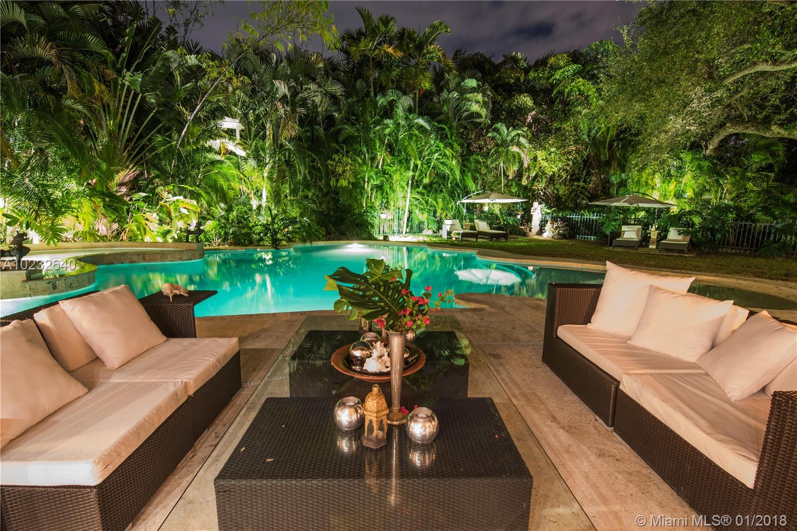 Stunning residence, East of US1. Just 2 blocks from the Bay on a quiet cul-de-sac street. Open floor plan w/ plenty of Natural Light, top quality renovations, new gourmet kitchen w/ quartz counter tops and European cabinetry and appliances. Marble floors throughout. Unique and very private grounds and gardens with marble patios. 12,249 Sq Ft lot with Centenarian Oaks, lush landscaping (over $250k spent) with free-form pool w/ beach, Jacuzzi and waterfall. Priced to sell! Motivated Sellers, Easy to Show!
