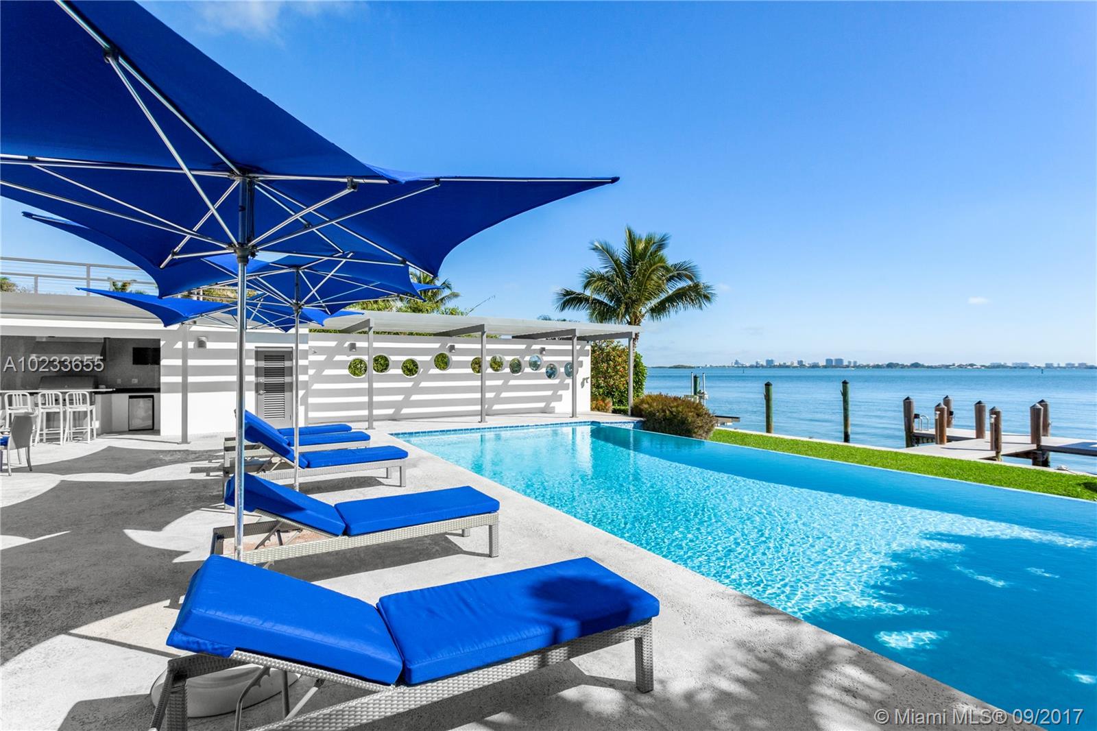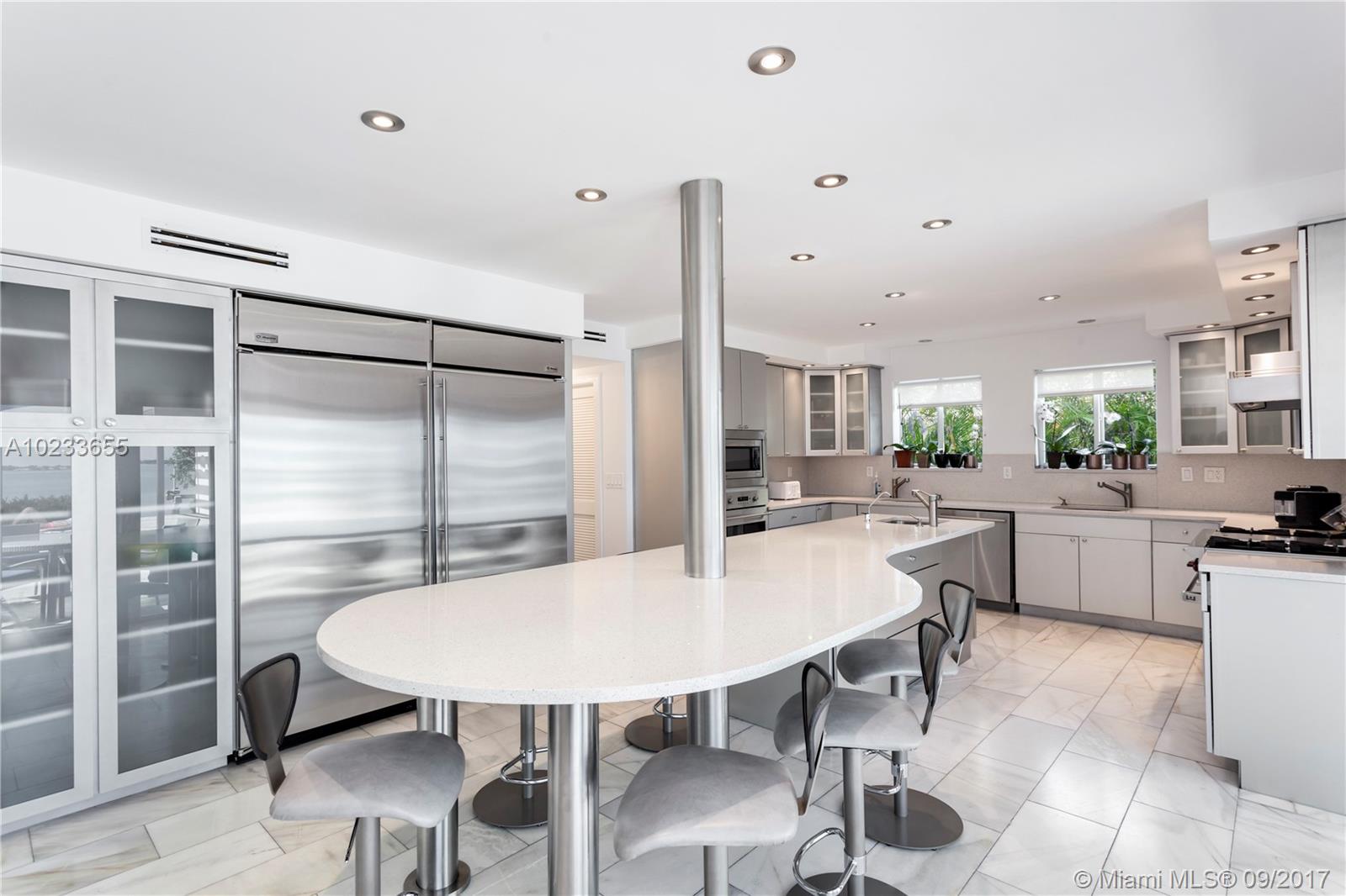 Enjoy living in this contemporary masterpiece completely remodeled in 2008, located on the wide open bay. 80+ Ft of water-frontage with panoramic views, private dock and 2 boat lifts. This 6 BR/5.5BA home is energy efficient, has a generator & 3-car garage. Take in stunning open bay views throughout this 5100sqft home. Modern design features custom stainless steel staircase, marble floors, floor-to-ceiling impact glass, infinity pool and summer kitchen.“Security Video/Audio Devices Operating on Premises.”