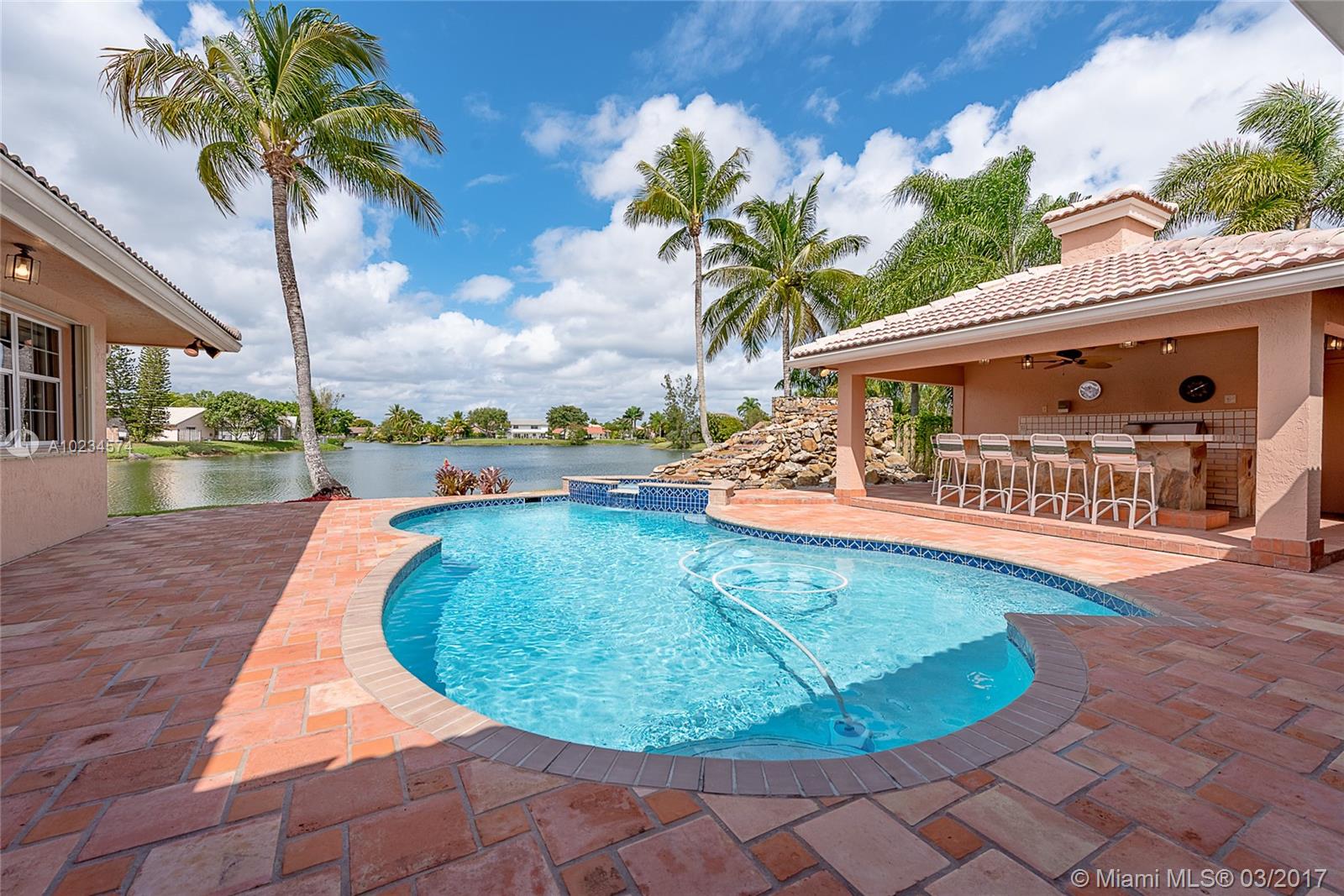 Custom Built Home in one of a kind street, beautifully updated, meticulously maintained. 4 Bedrooms with 2 and half bathrooms inside with pool,spa and spectacular waterfall overlooking lake is a dreamers delight. Great for entertaining around pool has built in BBQ area with full bathroom outside. Home has many unique features to boast about such as kitchen with granite counter tops and stainless steel appliances, cathedral ceilings, marble floors, Accordion Shutters, Backup Generator and so much more.