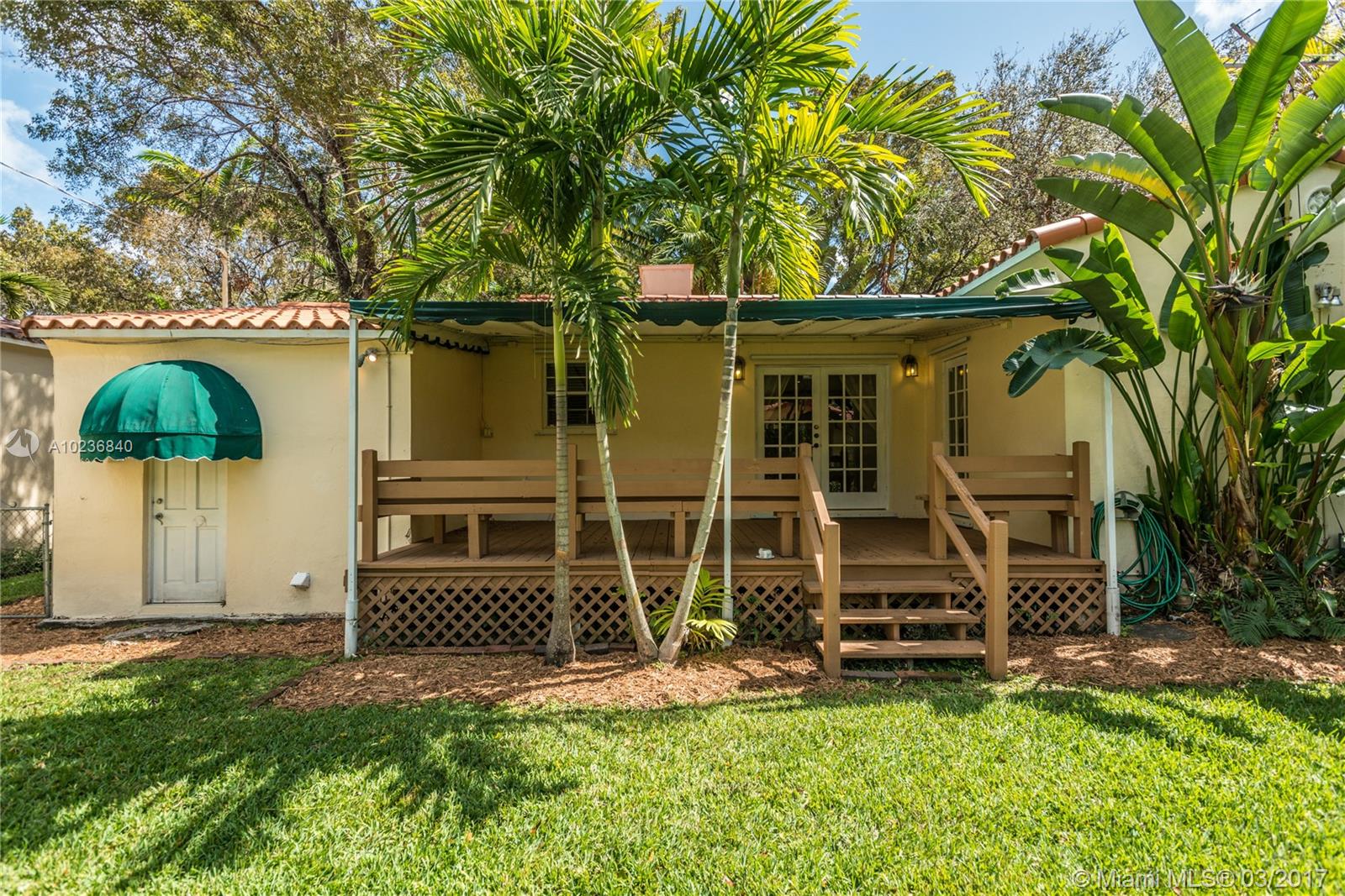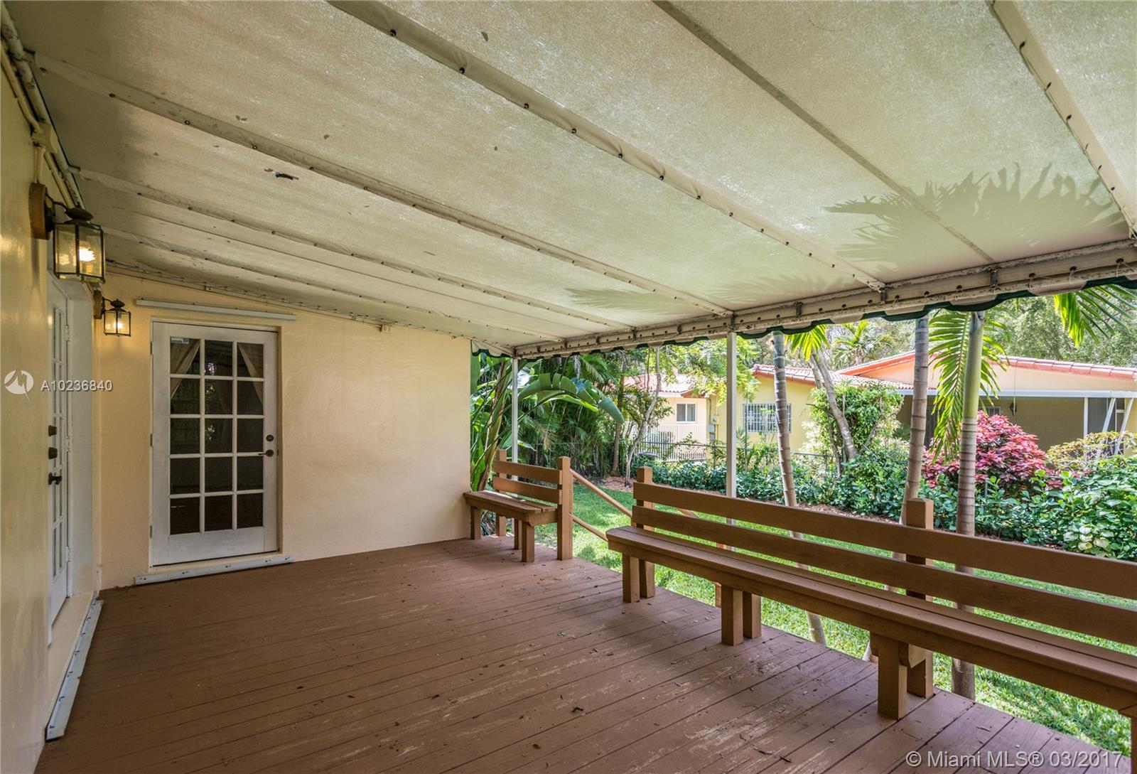 N. Gables gem on quiet & picturesque street, with ample L-shaped kitchen, good layout, covered back patio for outdoor entertaining or overflow room for kids to play. Beautifully maintained original features i.e. hardwood floors, stone fireplace, architectural arches, high ceilings, recessed lights, 1 car garage, barrel tile roof from 2006 w/many years of life. Recent updates are new wood deck, sprinkler system w/timer, new washer/dryer, recently tented, storm panels, fenced yard, alarm. Great schools!