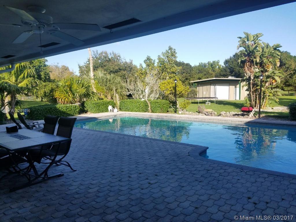 3/2 pool home on 1.25 acres. Remodeled kitchen with extra pantry. Oversized 19x36 pool & screened patio. 30 x 50 steel building with electric and water. Two concrete slabs for RV or boat. 24 x 30. Solar water heater with 80 gallon holding tank/water heater. AC and Roof replaced 2005,new garage door 2008, security system, impact windows. Property is fenced. All underground utilities. Family, horse friendly, town of Southwest Ranches. Using preferred lender strongly encouraged.