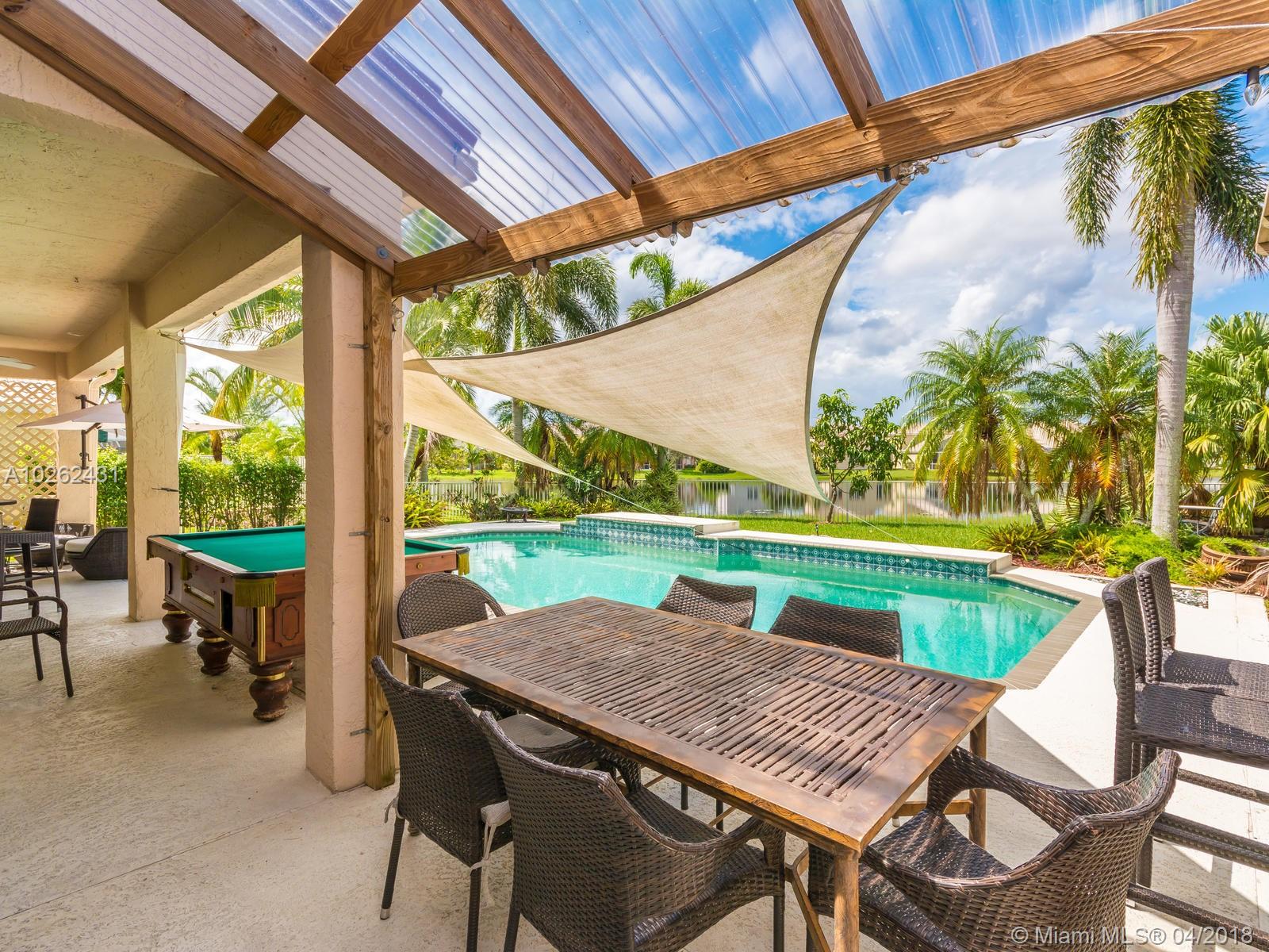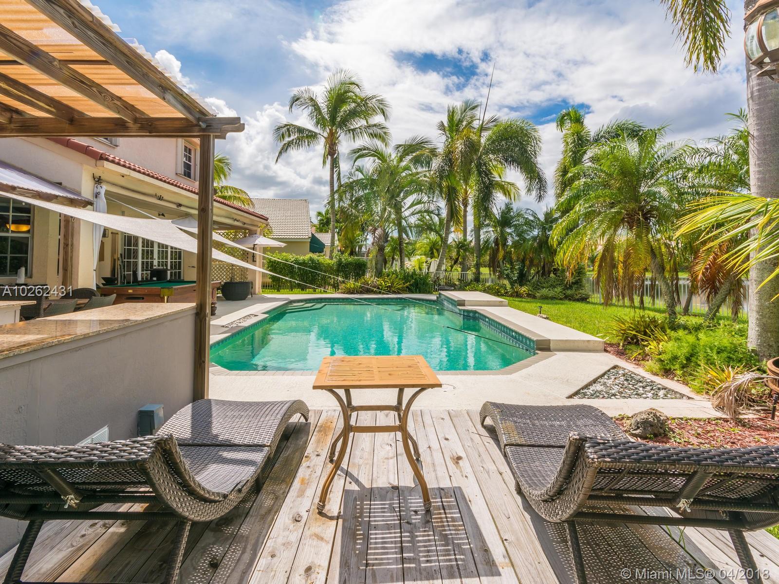 This house is Unique, It is in a Cul de Sac with a very large lot, Lake view. Pool , Lake . New Bathrooms , New Stair Rails. Kitchen.new Painted.New Generation Air condition. Outdoor Kitchen and Barbecue area.out door wood Oven . California Closets . GYM .Double Phone Line . Attic.Alarm System with high security door by door, and window by window detectors, fire , Glass Broke detector by window. Cable wire, Direct Tv wired . Wifi . Crown Molding . Stone wall with fire Place and water fall.French door . Hunter Douglas Window Treatment . Fenced all around pool area . Exterior Lighys . High Impact Windows and Door , Acordeon Shutters and much much more
