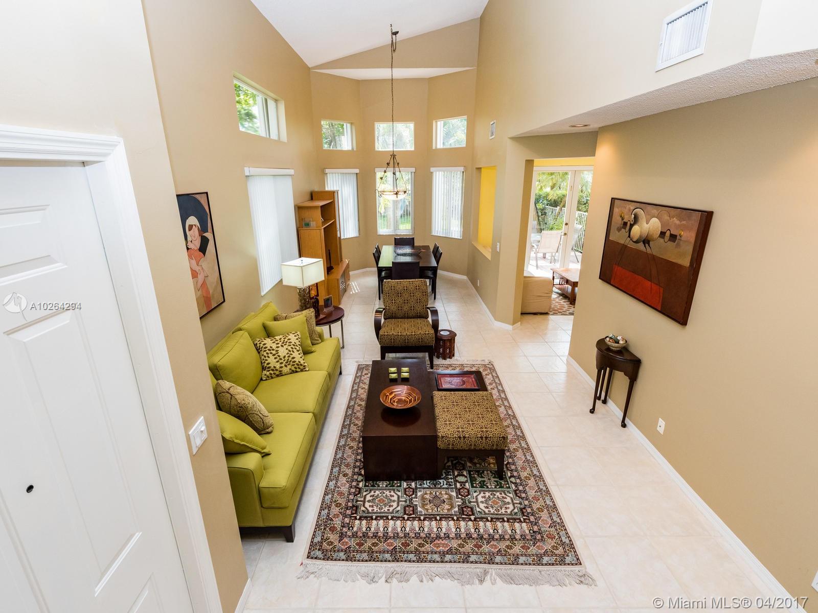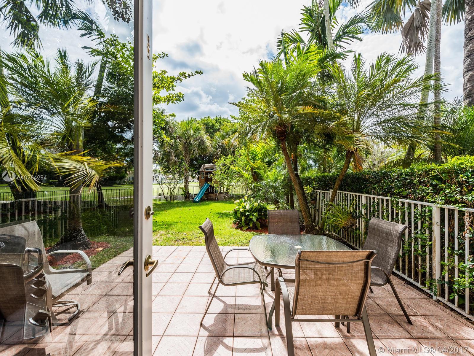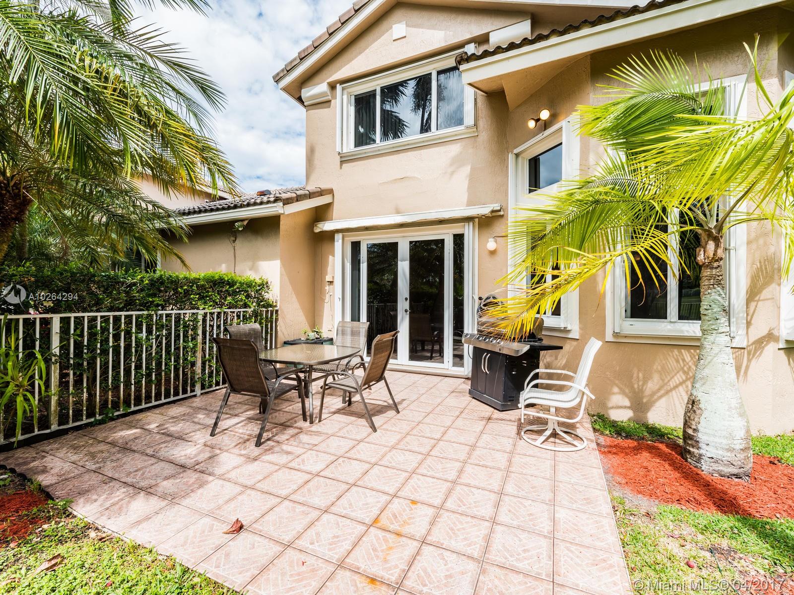 Impeccable end-unit townhome with water and golf course view! This lovely home features volume ceilings, neutral tile throughout first floor, and carpet on second floor. Spacious kitchen has snack counter, tile countertops, and white appliances. All bedrooms are upstairs along with 2 full baths. Half bath is downstairs. Family room has french doors leading out to tiled patio. Step outside and enjoy a fully fenced backyard with view of golf course and water on oversized lot w/over 7,500 sqft of land! Other highlights of this home include accordion shutters, interior laundry room, A/C that is less than two years old, and long driveway for extra guest parking. HOA covers landscaping, cable TV, and alarm system. Community amenities include 24-hour guarded gate, pool, child play area, and more!