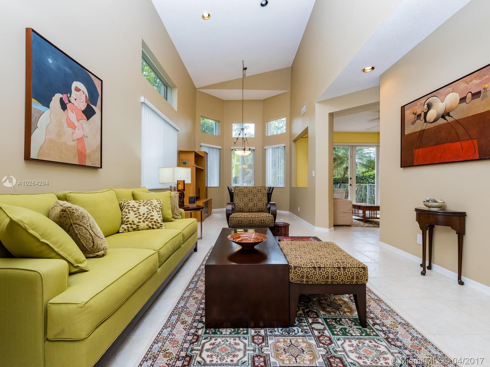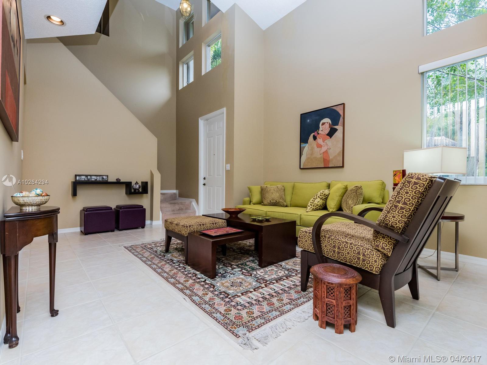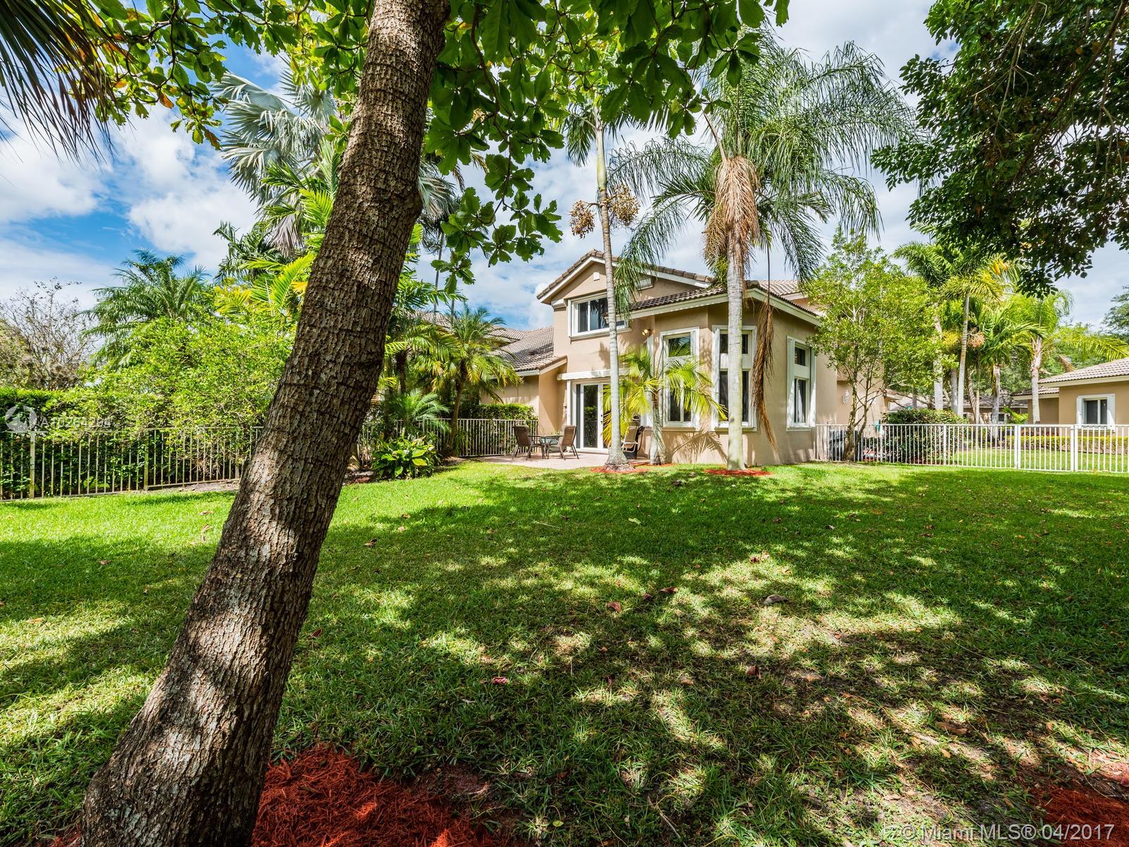 Impeccable end-unit townhome with water and golf course view! This lovely home features volume ceilings, neutral tile throughout first floor, and carpet on second floor. Spacious kitchen has snack counter, tile countertops, and white appliances. All bedrooms are upstairs along with 2 full baths. Half bath is downstairs. Family room has french doors leading out to tiled patio. Step outside and enjoy a fully fenced backyard with view of golf course and water on oversized lot w/over 7,500 sqft of land! Other highlights of this home include accordion shutters, interior laundry room, A/C that is less than two years old, and long driveway for extra guest parking. HOA covers landscaping, cable TV, and alarm system. Community amenities include 24-hour guarded gate, pool, child play area, and more!