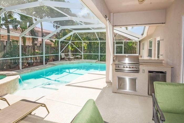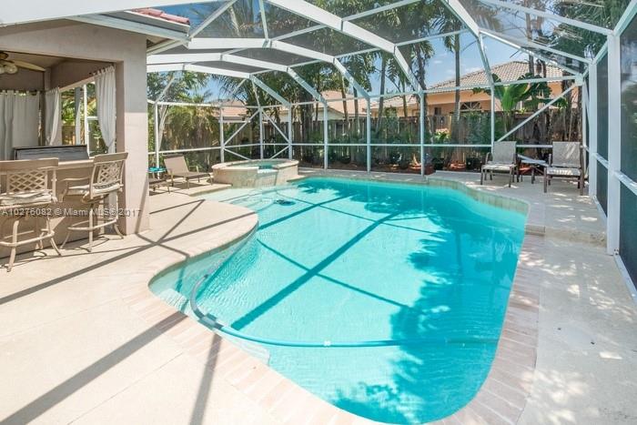 Beautiful 3/2/1 w/pool home in 24 hour manned guard gated community of Poinciana Parc. The stunning pool and waterfall spa are both heated salt water in upgraded larger backyard. Gorgeous lushly landscaped backyard is both fully fenced for privacy and screened in and features a covered patio, an outdoor kitchen perfect for entertaining and even an outdoor shower. Most of the household appliances are high end Bosch stainless steel. Large master bedroom has 2 closets, one is a walk in. Hurricane shutters are included. Excellent Davie schools. Located minutes from Sawgrass Mall shopping, major highways and airport.