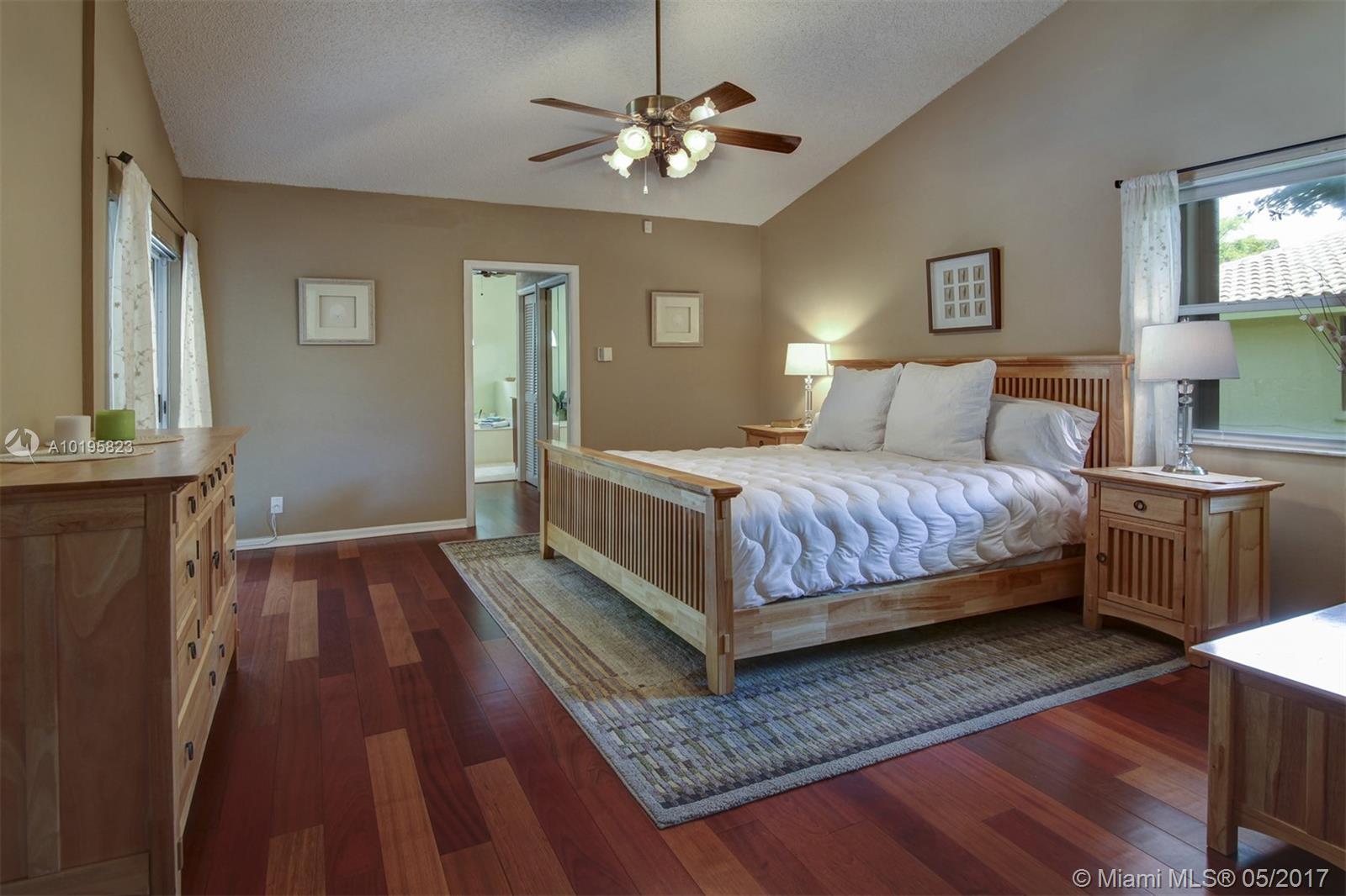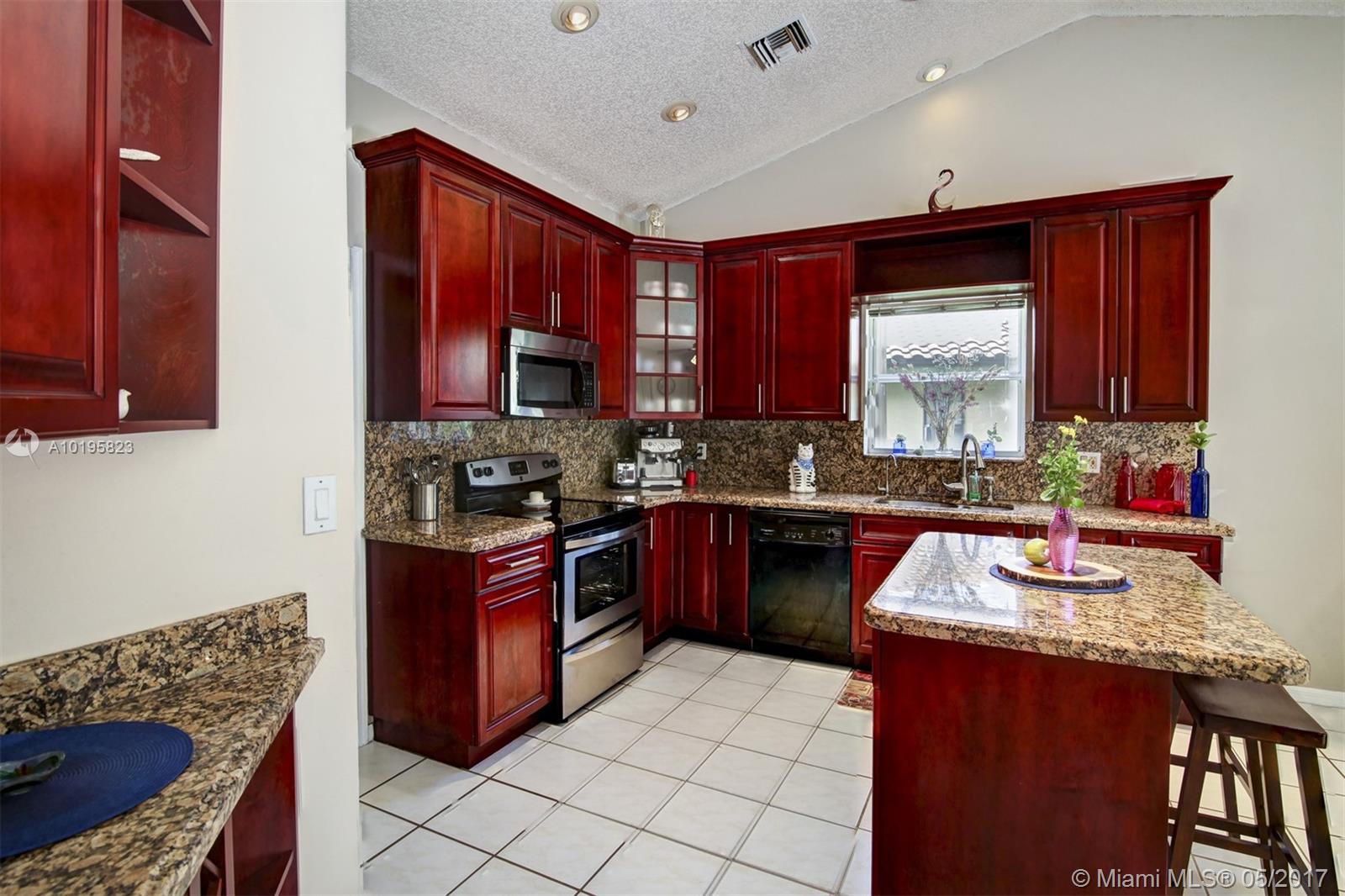 4 Bedroom, 3 Full Bathroom, Office (optional 5th Bedroom) well-kept home on quiet street near culdesac, A+ schools (Country Isle Elementary, Tequesta Trace Middle, Cypress Bay High, parks in walking distance, Weston Town Center in walking distance, sidewalks on both sides of the street, partial lake view, 40 x14 pool, roof 7 yrs, new sprinkler, accordion shutters, aluminum fence, two car garage, 4 car driveway, over 20 mature palm trees on property, all appliances included, high ceilings, new refrigerator and stove, granite counter tops, 44 inch cabinets (cherry wood), recessed lights, separate pantry, separate washer and dryer room, master BDR on ground floor with hardwood floors, 2 walk in MBR closets, large master suite with 2 cabinet sinks, shower, separate garden tub plus cabana door