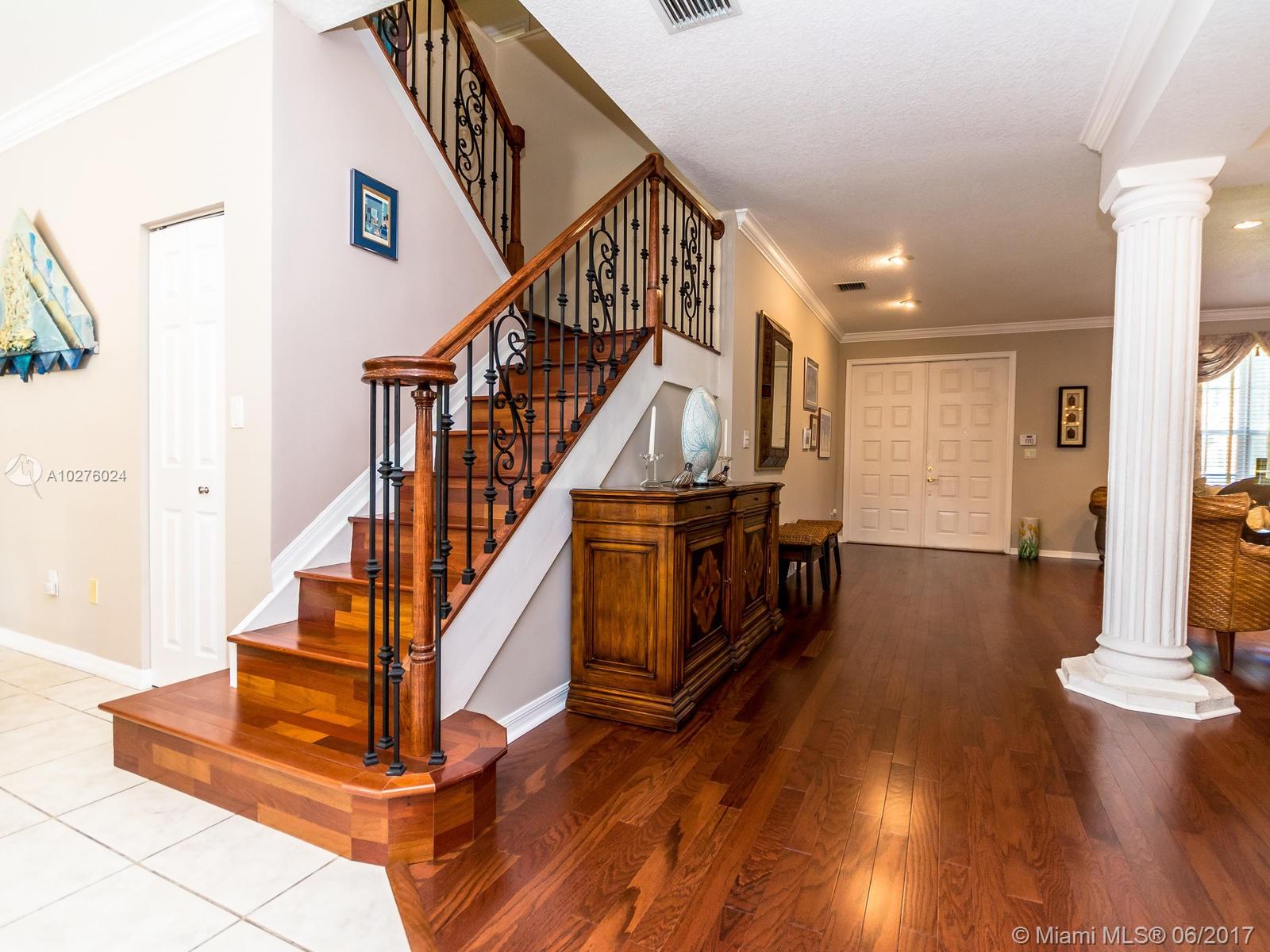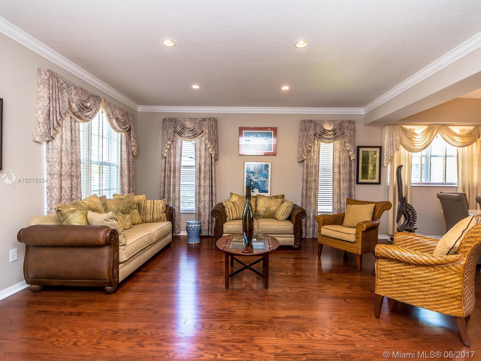 Tropical Oasis Pool Home - over 2,900 sq/ft -Resort community -Designer harwood floors, crown molding, granite counters, upgraded 42 inch cabinets, upgraded stainless steel appliances, upgraded a/c unit (inside and out), surround sound speakers, rod iron railing staircase, recessed lights thru-out, french doors off family rm to pool area. Covered patio with full size tiled balcony off master suite. (Master features large sitting rm-Builder offered as 5th bdrm). Excellent walk-in closets. Spacious 3 car garage. HOA includes (water/sprinklers syst. & maintenance, grass cutting, alarm monitoring, guard gated entry, 5 STAR Hyatt-Like Resort clubhouse - 3 pools, 4 tennis, racquet court, aerobics and fitness center, beach volleyball, soccer and full size basketball. Basic cable is also included)