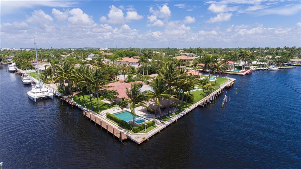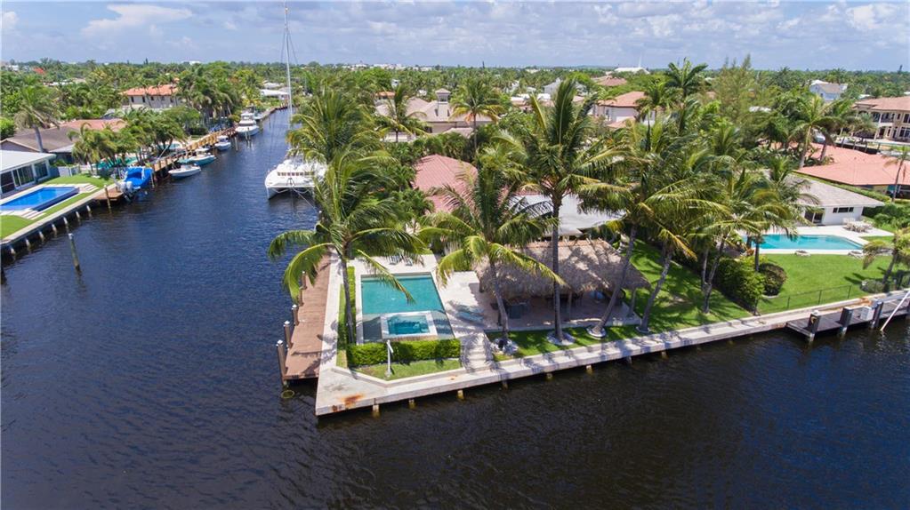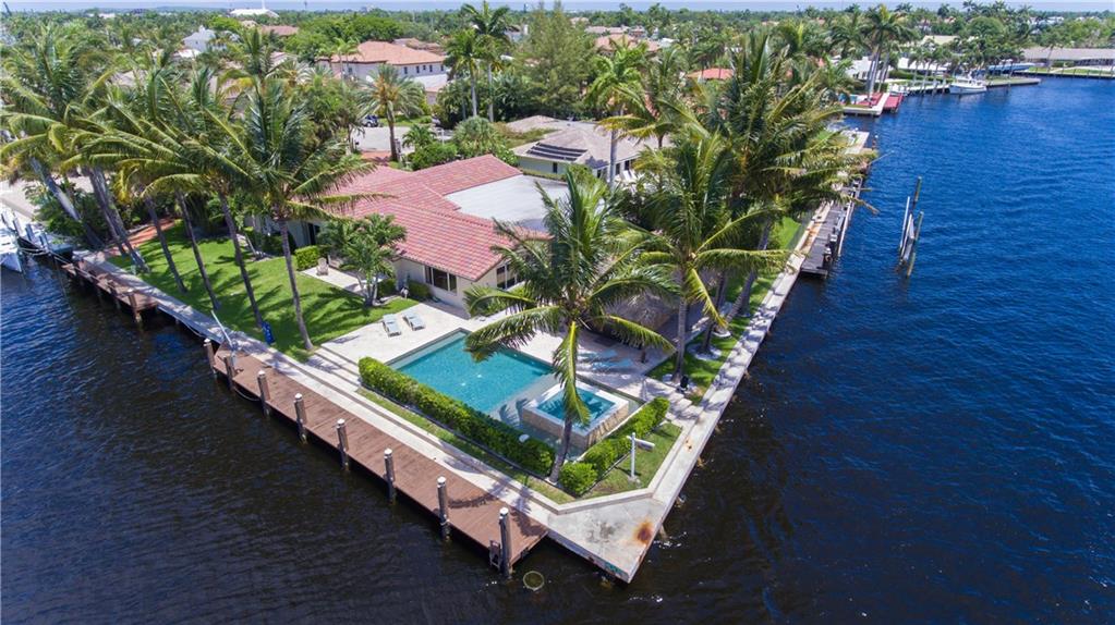 One of the most spectacular ICW point lots available with endless water views. This stunning 4bd/4ba pool home on a lot over 16,000 sq. ft. is seconds to the Hillsboro Inlet with 250 ft. of water frontage & two docks for your mega yachts. The extra large great room and gourmet kitchen is positioned perfectly with expansive water views. Entertain under the custom tiki hut with lounging and bar area or enjoy the beautiful resort style pool and spa as you watch the boats go by