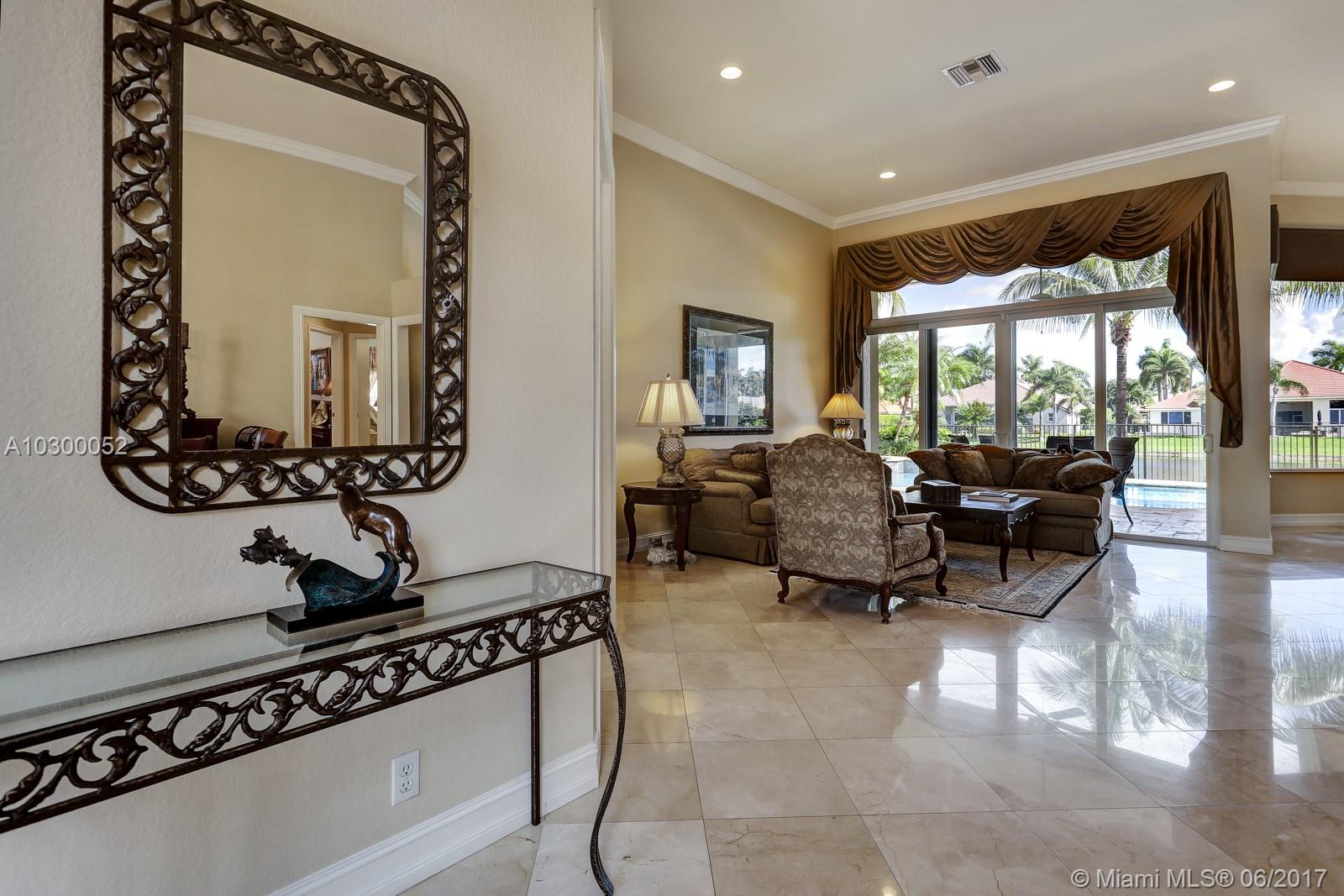 Lakefront custom built Greenwich model, almost 3000' sq. of luxurious and upgraded living area w. 4BR, 3FBA + Den. Crema Marfil marble floors throughout the social areas. Gourmet kitchen features custom Quartzite countertops (Blue Louise), 42” wood cabinets, under-cabinet lighting, stainless steel appliances, including Sub-Zero refrigerator/freezer, KitchenAid double oven & microwave, warming drawer & dishwasher. Impact glass front & rear doors and windows, accordions shutters on the sides. Tiled roof & gutters installed in 2007. Gold travertine pool deck & recently resurfaced saline chlorinated pool & spa with waterfall feature. Fully maintained dual zone, multi-speed 18.5 Seer A/C units. Hybrid wired and wireless security system with 2 remotes and digital dialer. Lake fed irrigation.