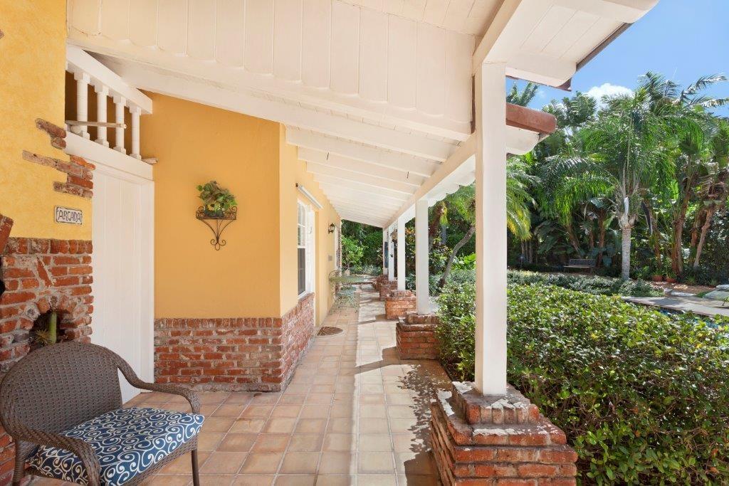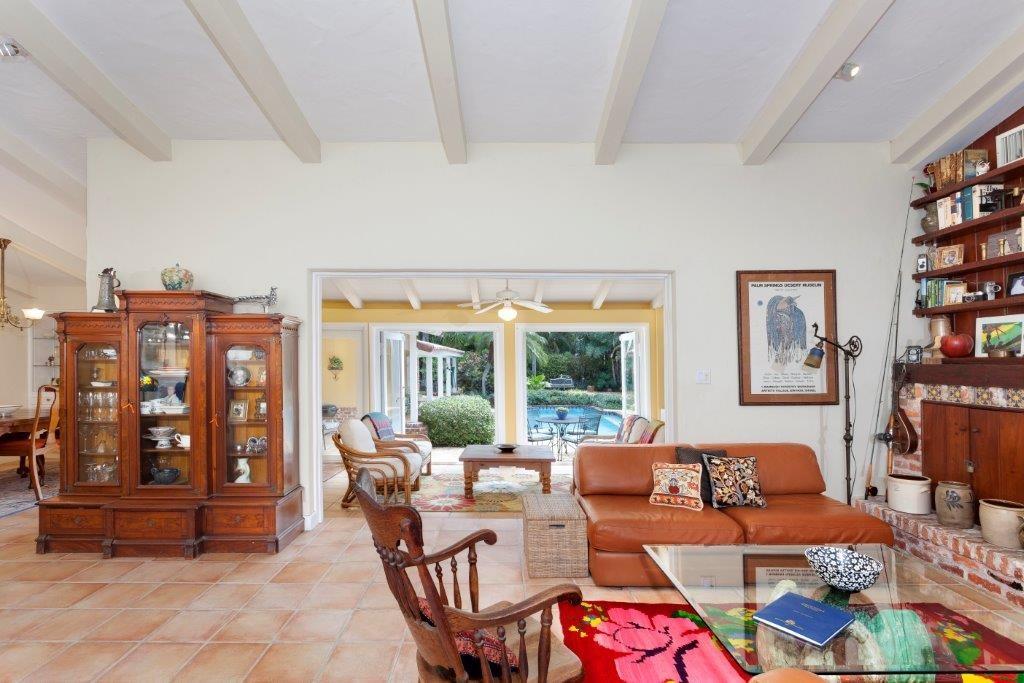 Offering relaxed indoor/outdoor living in its own tropical oasis, this charming c. 1939 Old Florida-style estate is a local landmark located just steps from Las Olas Boulevard and within walking distance of the beach. Comfortable and inviting with beamed cathedral ceilings and Saltillo tile floors, the main residence and guest house open to verandahs by the gorgeous pool terrace completely secluded by mature greenery. A dramatic floor-to-ceiling brick fireplace wall highlights the living room.