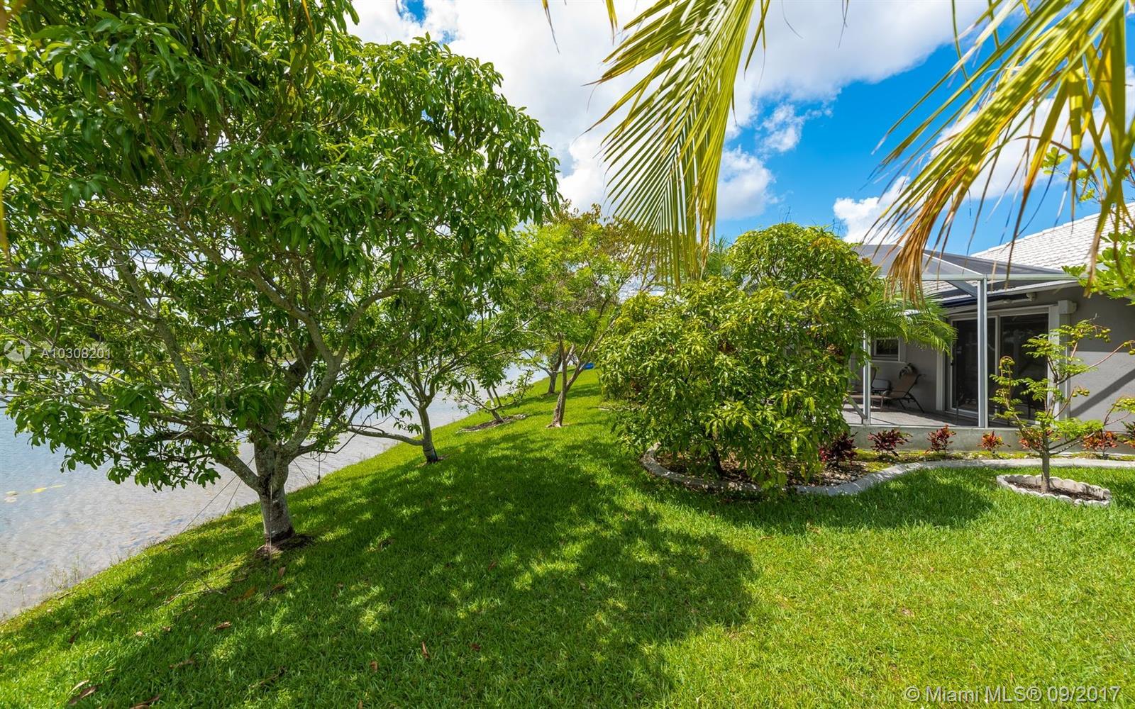 Perfect starter home on the LAKE. Features include a screened-in patio that overlooks the lake / preserve, ACCORDION shutters, fully brick pavered driveway, walkway and patio, retractable awning, lake drawn automatic sprinklers, mature landscape with various fruit trees, diagonally laid tiled living areas, open kitchen with island, great room, indoor washer-dryer utility room and wired for alarm. Sale includes great room TV, Bose surround & outdoor speaker sets along with any other items that will remain for convenience at the Closing date. Gated community with low quarterly HOA fees.
