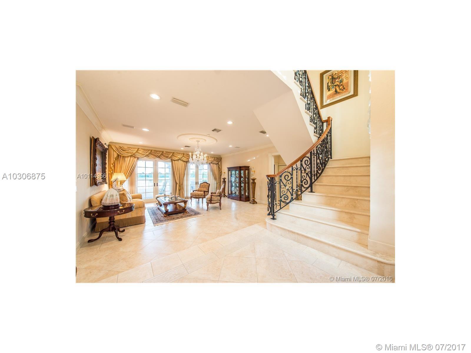 Located in prestigious Doral Estates, this magnificent two-story home is a must see with one of the only reaming unobstructed lake & golf course views in the area. This home features 5 BD/4.5 BA, gourmet kitchen & formal dining & living rooms. Other features include central vac system, walk-in closets, impact glass & French doors. The master suite upstairs, which includes a grand master bath, boasts wall to wall glass doors that open to a large balcony overlooking the waterfront pool and spa. 2 car + golf cart garage.