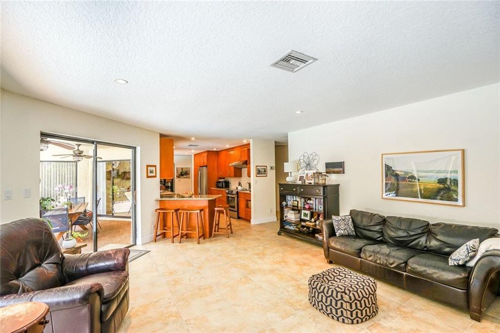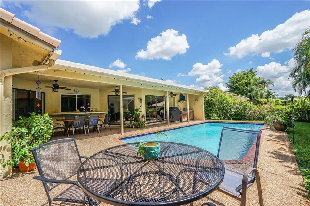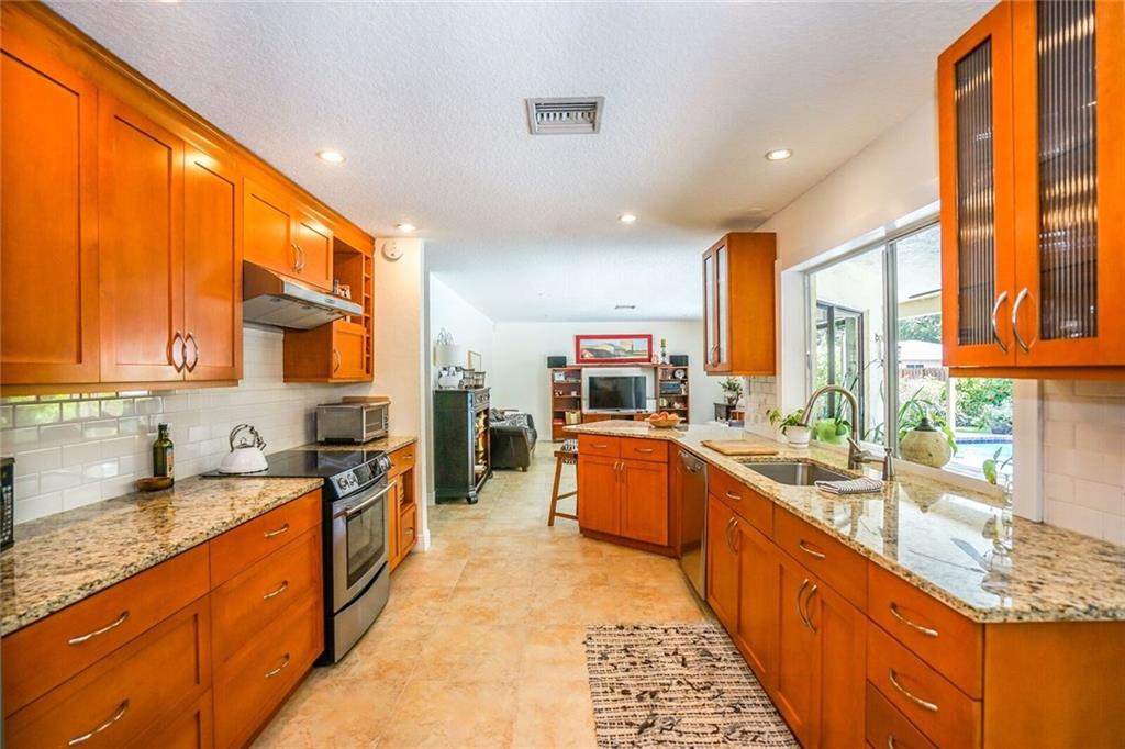 Updated, spacious 4 bedroom/2 bath - pool home. Large foyer entry, formal dining and living with beautiful wood floors and vaulted ceilings, custom kitchen w/tall maple cabinets, pull outs, wine rack, lots of over sized drawers, extra deep pantry, granite counters, stainless appliances, bar seating, breakfast area open to the large family room. sliders all along back side, light, bright and overlooks relaxing, private pool area. Updated bathrooms, impact windows (all but one), new pool finish.