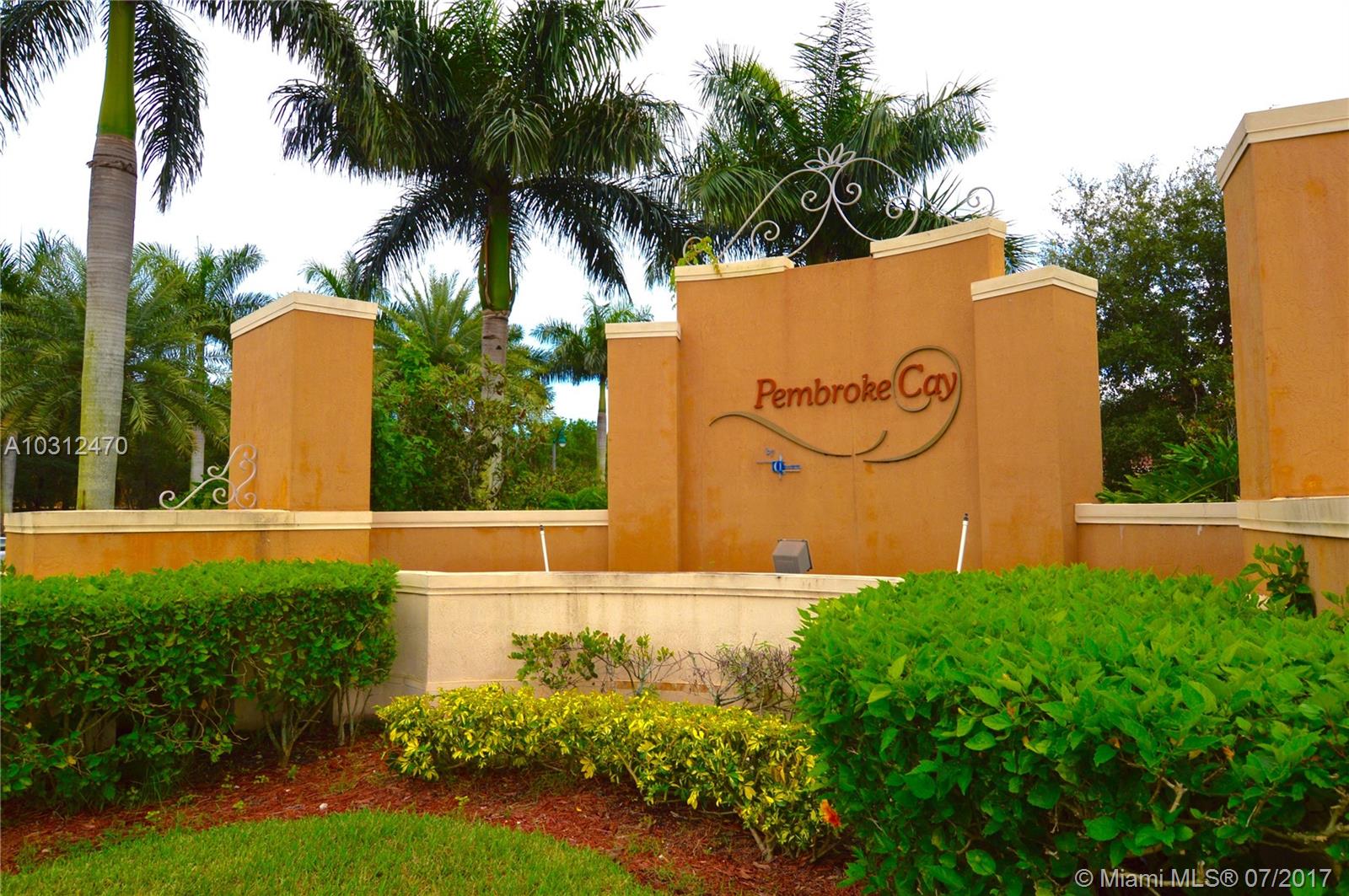 This is a beautiful 3 bedroom 2.5 bathroom home located in the gated community Pembroke Cay in Pembroke Pines. Inside you will find wonderful living space, washer and dryer hookup, and a lovely backyard overlooking the lake. It is in a great location in Pembroke Pines, very close to I-75, the Turnpike, CB Smith Park, Grand Palms Hotel and Golf Resort, and the Shops at Pembroke Garden. Don't miss out, schedule your showing today!