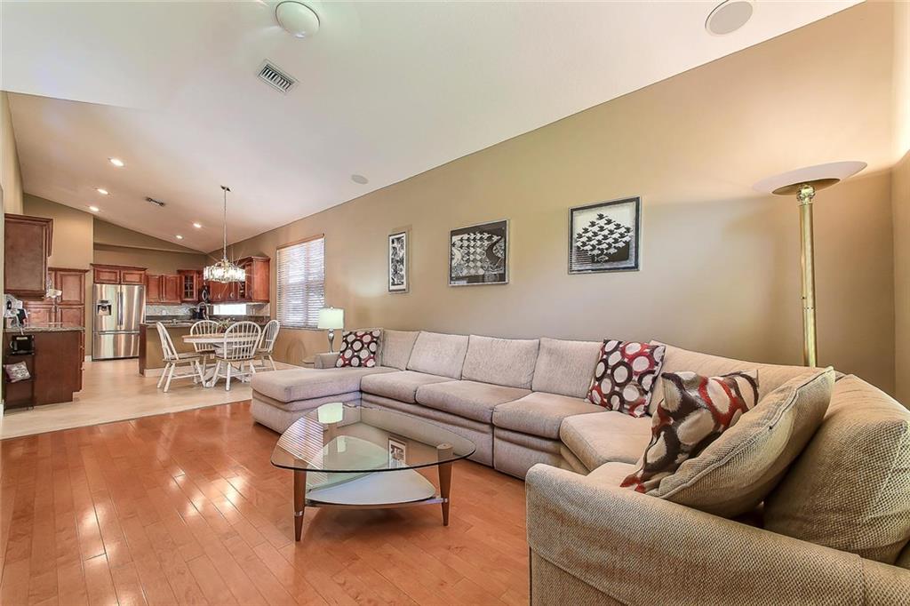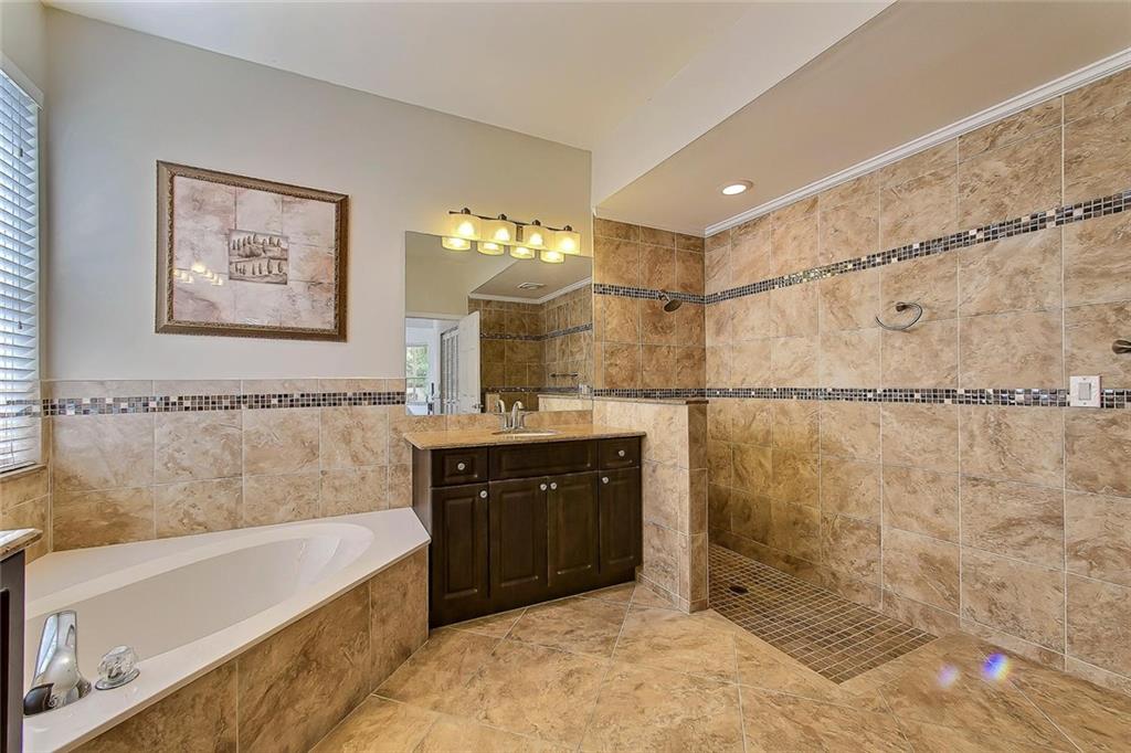 Fantastic updated & upgraded 2 story near cul de sac. Master suite + bedroom/bath down, 2 huge bedrooms & bath up. Architecturally attractive, soaring ceilings & palladium windows. Remodeled custom wood kitchen. Granite, stainless & more. Remodeled master bath with his & her wood vanities, granite, and porcelain tile. Rectified 20 x 20 porcelain tile downstairs. Wood floor in family room. Updated downstairs bathroom. Hi end carpets. Steps to recently updated community pool & tennis.