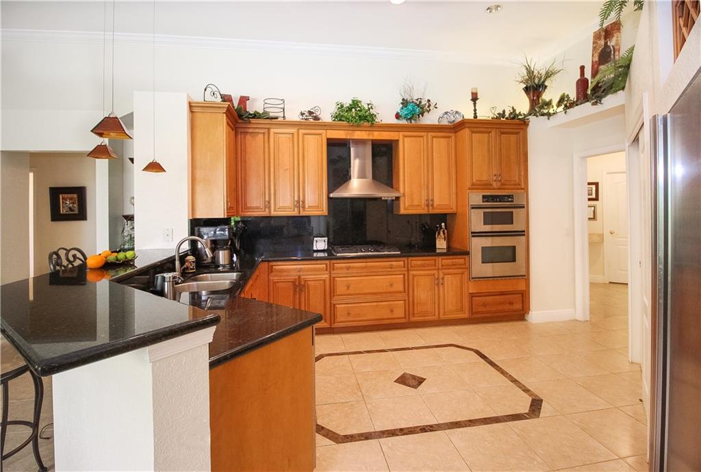 Gorgeous one story home with 5 bedrooms plus a nursery/office/work out in the master bedroom. Beautiful kitchen with rich real wood cabinetry, granite countertops, stainless steel appliances, snack bar, breakfast area and huge pantry. All bedrooms have wood laminate flooring, main areas have tile. Upgraded lighting throughout home. Custom draperies/window treatments in living areas. Backyard is completely private with lush landscaping. Home sits on a large corner lot. Covered seating around the pool.