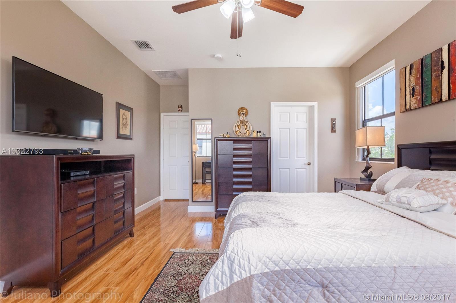 Vintage Place is considered by many a tranquil place to live in Doral Florida. This 4bed/3.5bath is located in a gated community with a private clubhouse overlooking a sparkling lake with meeting areas, fully equipped adult fitness center and children’s playroom, library, business center with media room and kitchenette, oversized swimming pool, spa, sun deck, BBQ gazebo and more. All bedrooms are upstairs. Designer wood cabinetry with Quartz countertop and full backsplash, stainless steel appliances, sink and pullout faucet, 22 C.F. side by side refrigerator/freeze with automatic ice maker, 30" free standing range with radiant top, microwave with built-in-hood, dishwasher, waste disposal, elegant bathrooms and more.