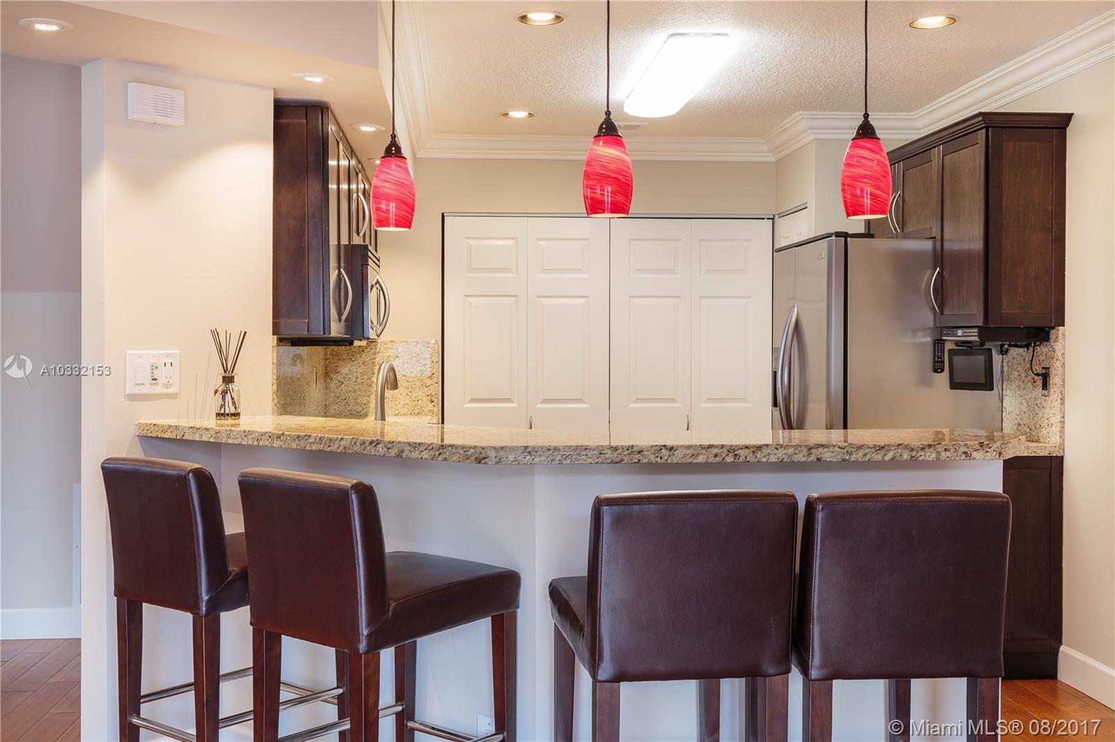 Beautiful and updated corner townhouse. Ready to move in, and all the work has been done for you! Wood floors throughout, granite kitchen, upgraded baseboards and moldings. Entertain in the lighted private patio/courtyard which opens off of the kitchen and great room. This home is centrally located with easy access to I-75, Palmetto Expressway, Florida Turnpike, shopping, parks and dining. The community is well-kept, safe, lovely, and includes a community pool and child's play area.