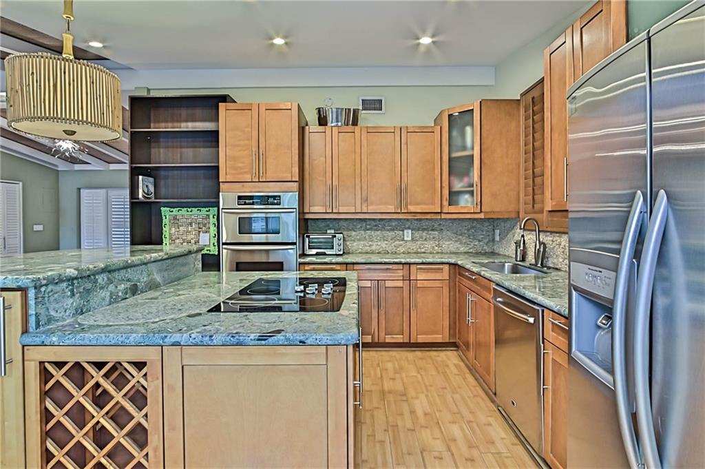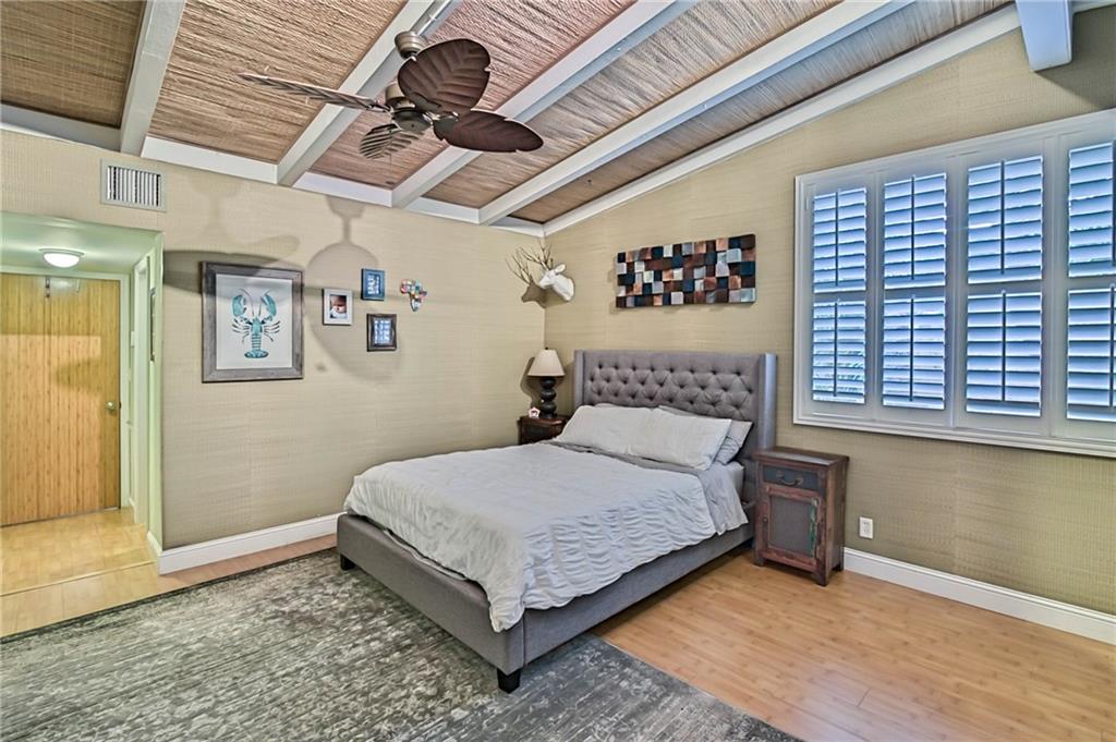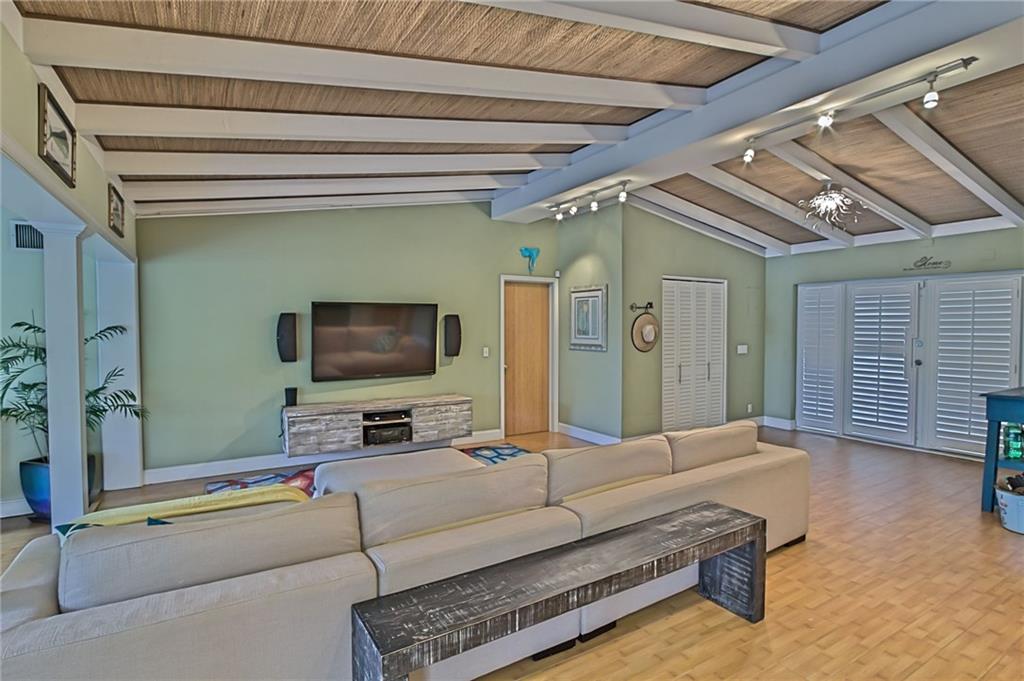 Beautifully updated waterfront home featuring 2 bedrooms plus den in main home plus separate 1 bed/office. Open living area offers high ceilings, wood floors, & is ideal for entertaining w/open kitchen including stainless steel appliances & incredible views of your lush tropical backyard. Spacious master closet & bath with two sinks, separate shower & tub. Low maintenance artificial turf & no fixed bridges. Relax under the Tiki Hut watching the game or jump in the heated pool after a long day on the boat!