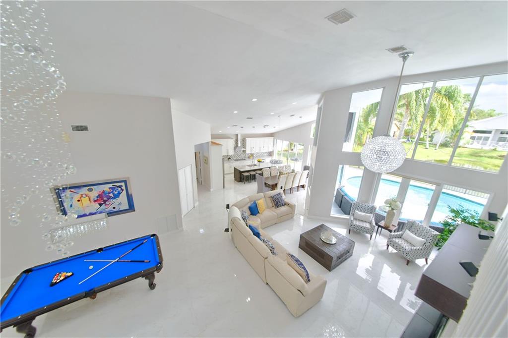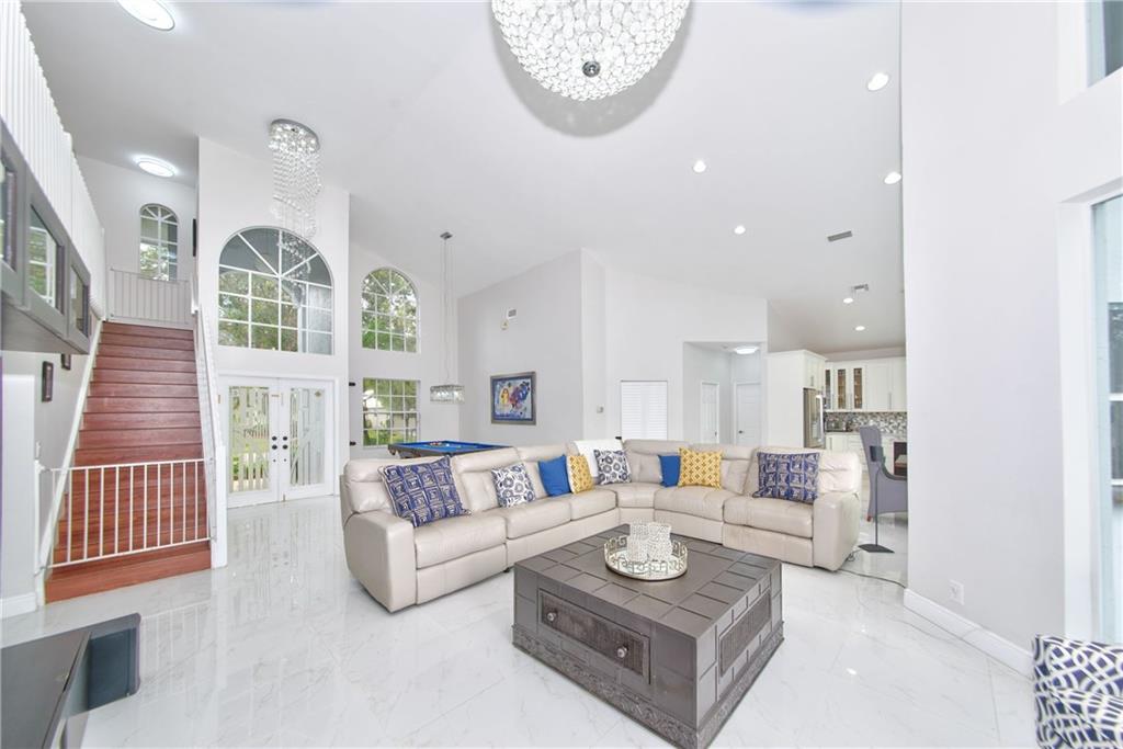 ABSOLUTELY STUNNING !! Wide open floor plan with soaring 19 ft ceilings. Over $135k in UPGRADES!! Gourmet kitchen with 42" wood cabinets, marble and quartz counters, SS appliances, double oven, and a 6 SEATER ISLAND! ALL BATHROOMS remodeled! Over 10k in custom LED crystal light fixtures! Built in sound system! Newer roof, A/C and pool heater. Freshly painted inside & Out! Waterfront, A rated schools, NO HOA! It's a true GEM and WILL NOT LAST…be the first to submit and offer!!!