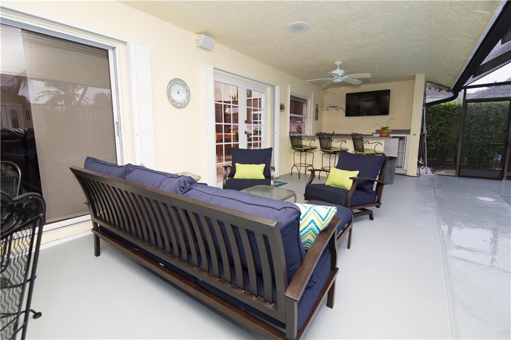 Beautiful waterfront home located in a guard gated community. This remodeled home features a circular drive, 2015 A/C, Travertine marble floors in living areas & rich laminate flooring & carpet in the bedrooms. Gorgeous skylights in kitchen with wood cabinets, quartz countertops & tumbled marble backsplash. Newer upgraded appliances. Beautiful dining room features built in cabinets, granite tops & wine cooler. Both baths updated in 2015. Bonus storage/work room. Solar heated screened pool with new finish!