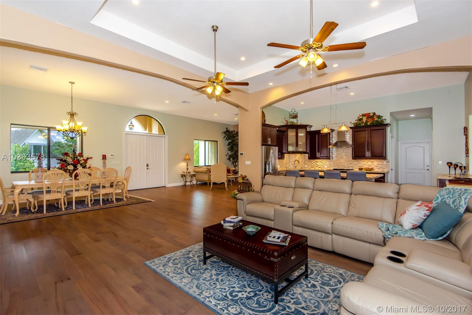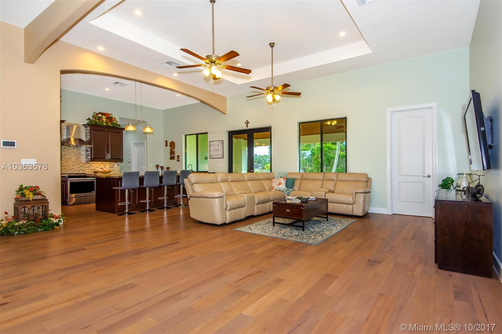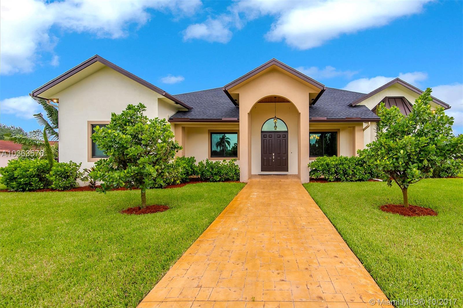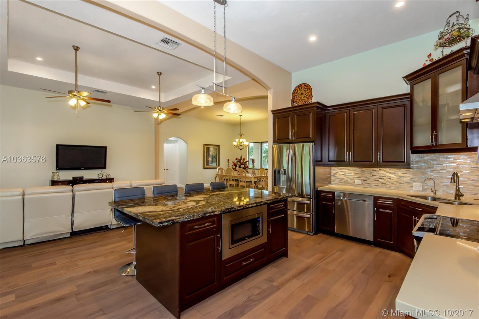 An elegant & newly built, country-style, estate home on an acre corner lot. A rare opportunity to own a new home amid the peaceful Davie farms & equestrian homes, while still being near world-class beaches, shopping, dinning & top schools. This home is turnkey & stress free. Thoughtfully built, featuring 3 bedrooms/3.5 bathrooms & an office/guest room, high impact windows & doors, volume ceilings, open layout with split bedroom floor plan, pantry & laundry rooms. Perfect for entertaining with warm wood floors, a custom all-wood kitchen & wet bar topped with quartz & granite counters & covered patio with an expansive lot. The oversized 2.5-car garage houses the 2 super-high efficiency Lennox HVAC units & has a workbench. Driveway fits 6 more cars.